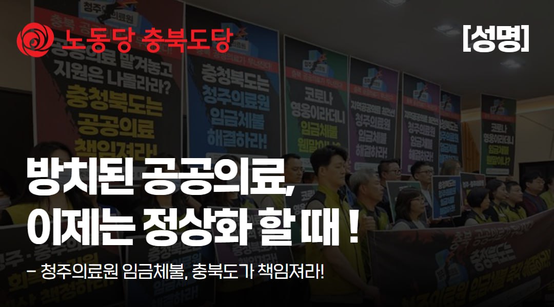 충청북도에 묻는다. 도민의 생명과 안전을 책임질 의지가 있는가, 없는가? 공공병원의 위기를 외면하며 어떻게 도민의 생명과 안전을 말할 것인가? 충북도는 청주·충주의료원의 공익적 적자를 보전하고, 청주의료원 임금체불을 즉각 해결해야한다, 경영위기를 노동자들에게 전가하는 행위를 중단하고, 보건의료 노동자들이 환자의 생명과 안전을 지킬 수 있도록 제대로 된 노동환경을 만들라! 노동당 충북도당은 청주의료원 임금체불 해결을 넘어 국가가 책임지는 공공의료를 만들기 위해 함께 할 것이다.
