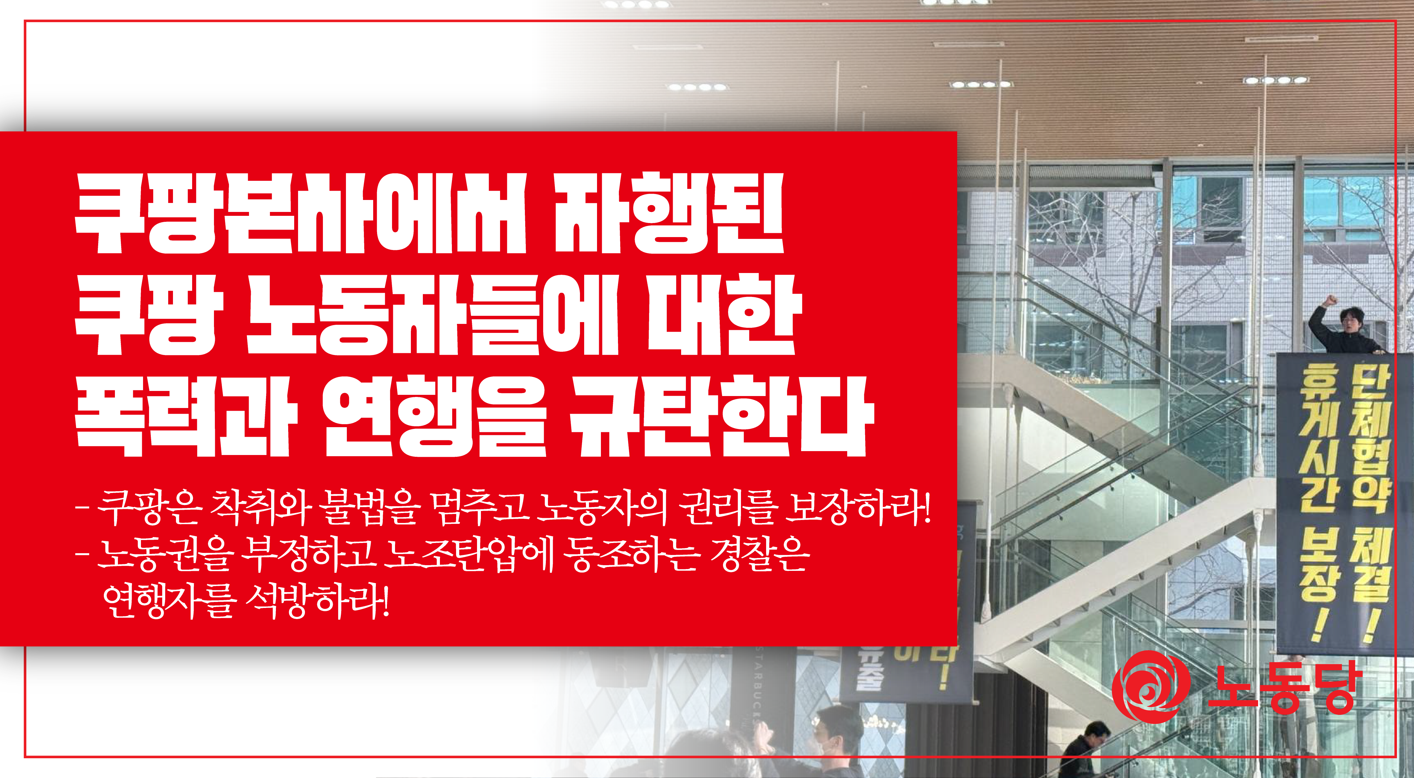 노동당은 쿠팡 노동자의 투쟁을 지지하며 항상 함께할 것이다. 그리고 쿠팡 자본과 경찰의 오늘 만행에 반드시 책임을 물을 것이다