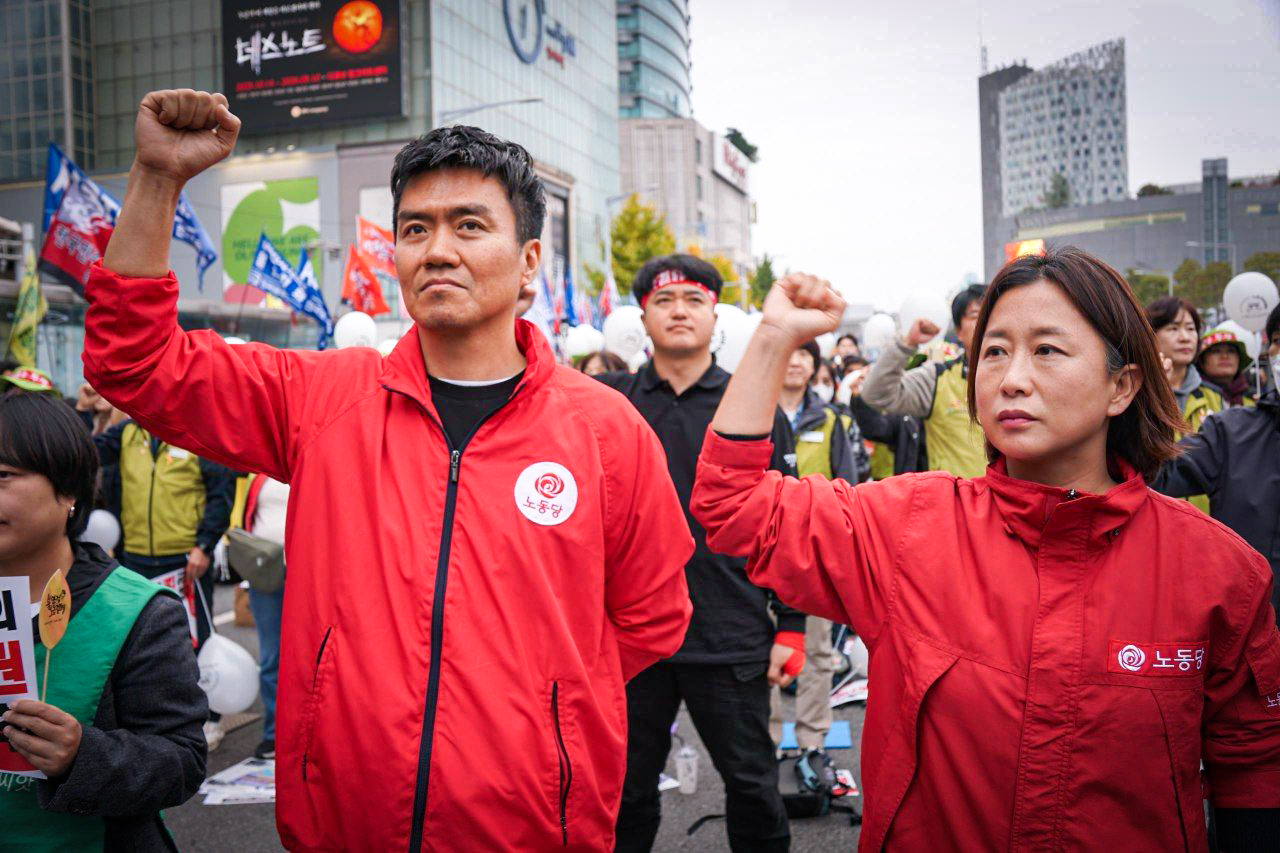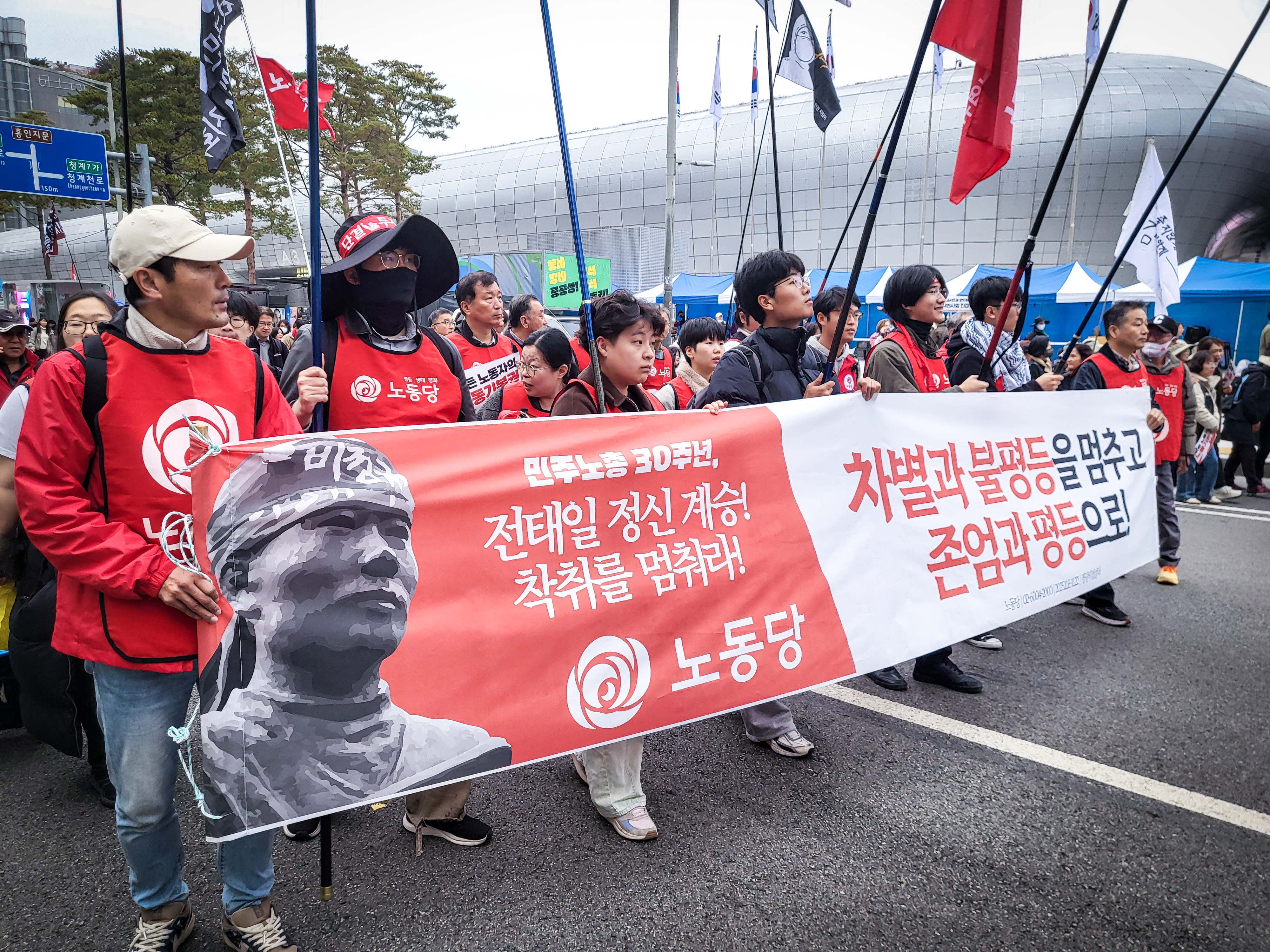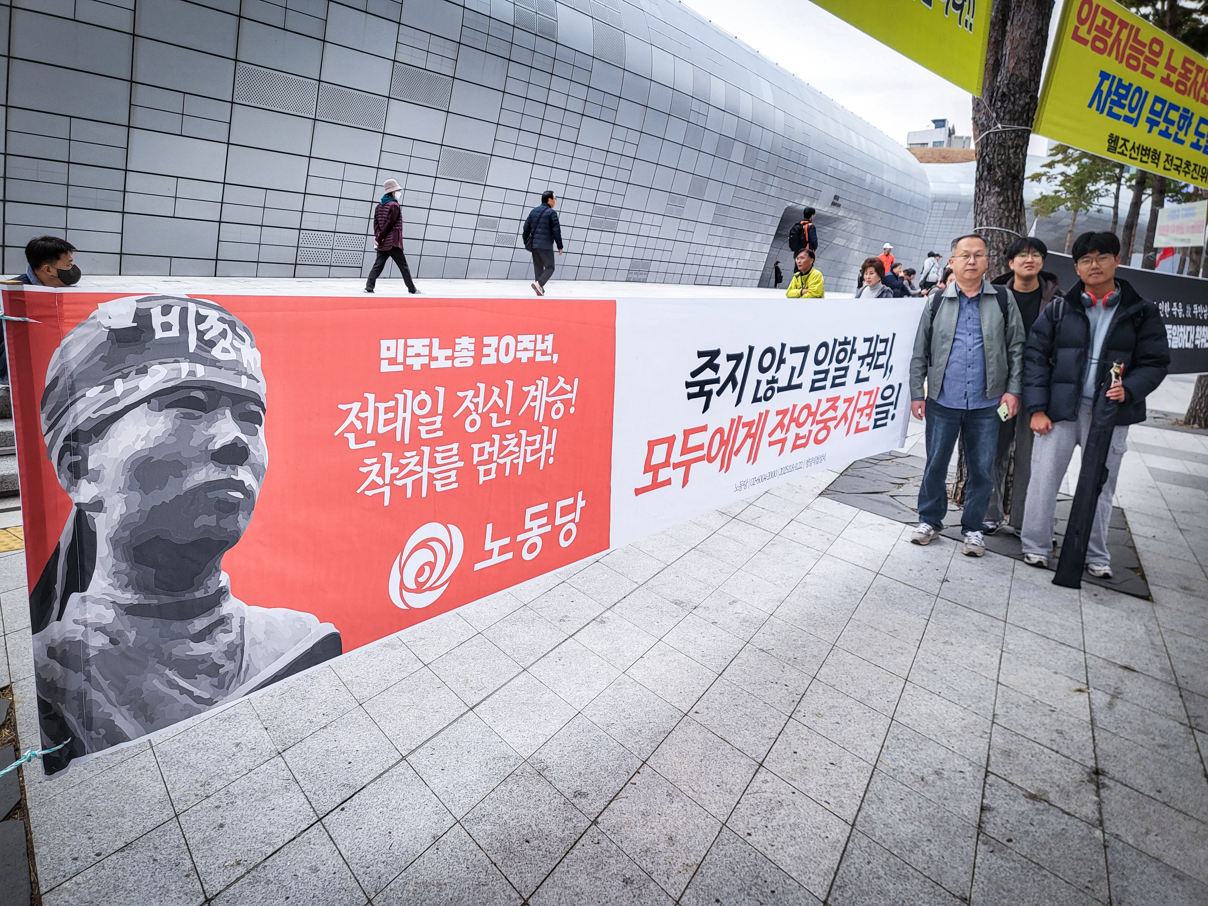 11월 8일 전태일열사정신계승 전국노동자대회가 열렸습니다. 55년 전 전태일 열사가 분신한 평화시장 인근 동대문역사문화공원에서 열린 지난 8일의 전국노동자대회에 노동당 고유미, 이백윤 공동대표와 김성봉 부대표, 그리고 노동당 당원들이 함께했습니다. 전국 각지에서 모인 노동당 당원들은 전태일 열사의 정신을 이어받아 노동자 주인 되는 세상을 향해 굳건히 활동해 나가겠다는 결의를 다졌습니다.