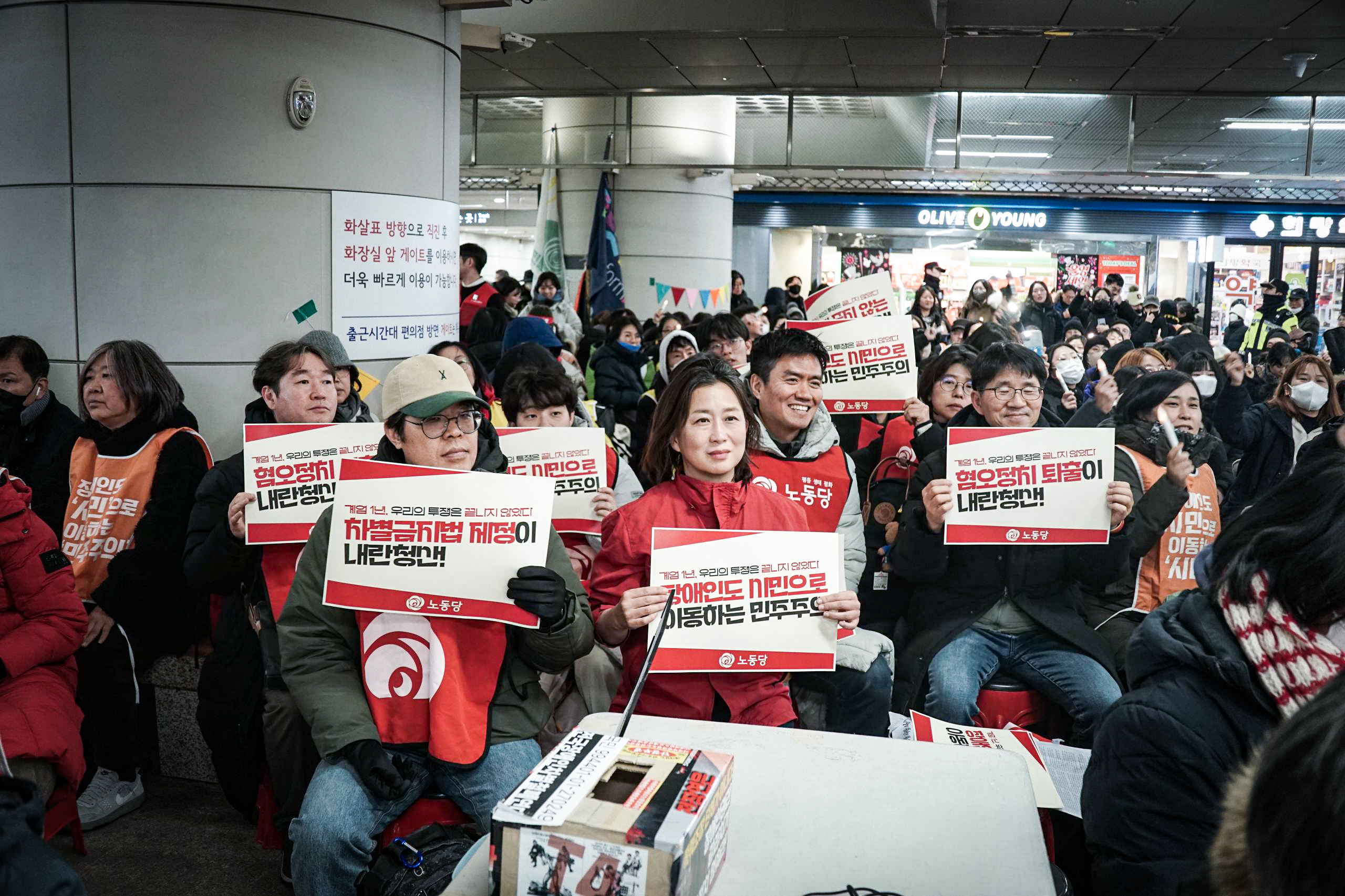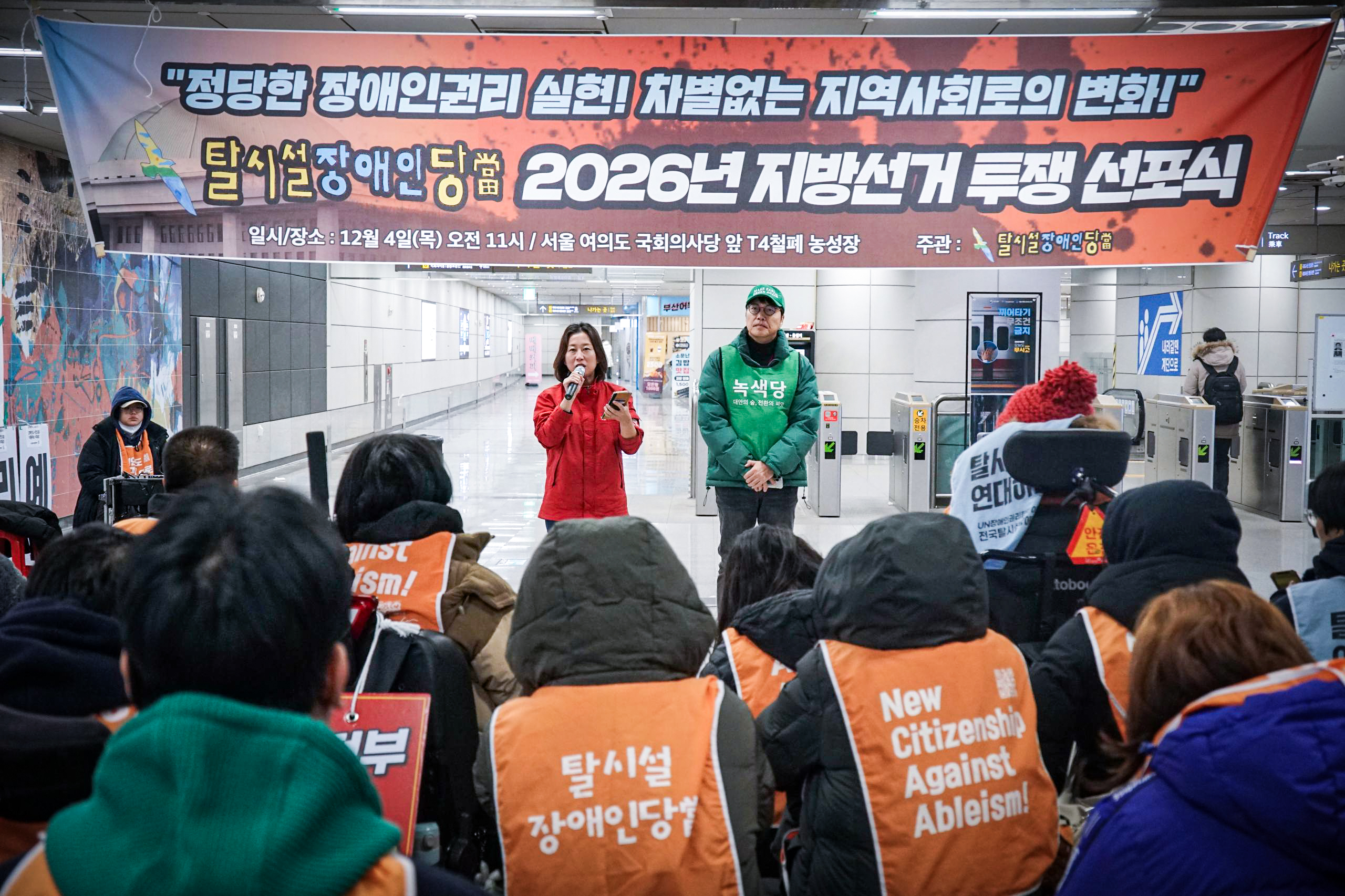 노동당은 12월 4일 오늘 11시 국회의사당역에서 열린 탈시설장애인당 지방선거 투쟁 선포식 참석으로 비상계엄 1주기 일정을 마무리했습니다. 선포식에 참석한 고유미 대표는 “노동당과 탈시설장애인당은 누구도 배제하지 않는 사회를 꿈꾼다는 점, 이윤과 효율 중심의 체제 속에서 권리를 빼앗긴 사람들과 함께 싸운다는 점, 자본주의가 불편하해고 두려워한다는 점에서 동지이고, 같은 붉은색이다”라고 연대의 뜻을 밝혔고, “장애인의 권리를 ‘시혜’로 돌려주는 정치를 끝내자”라고 결의를 다졌습니다.