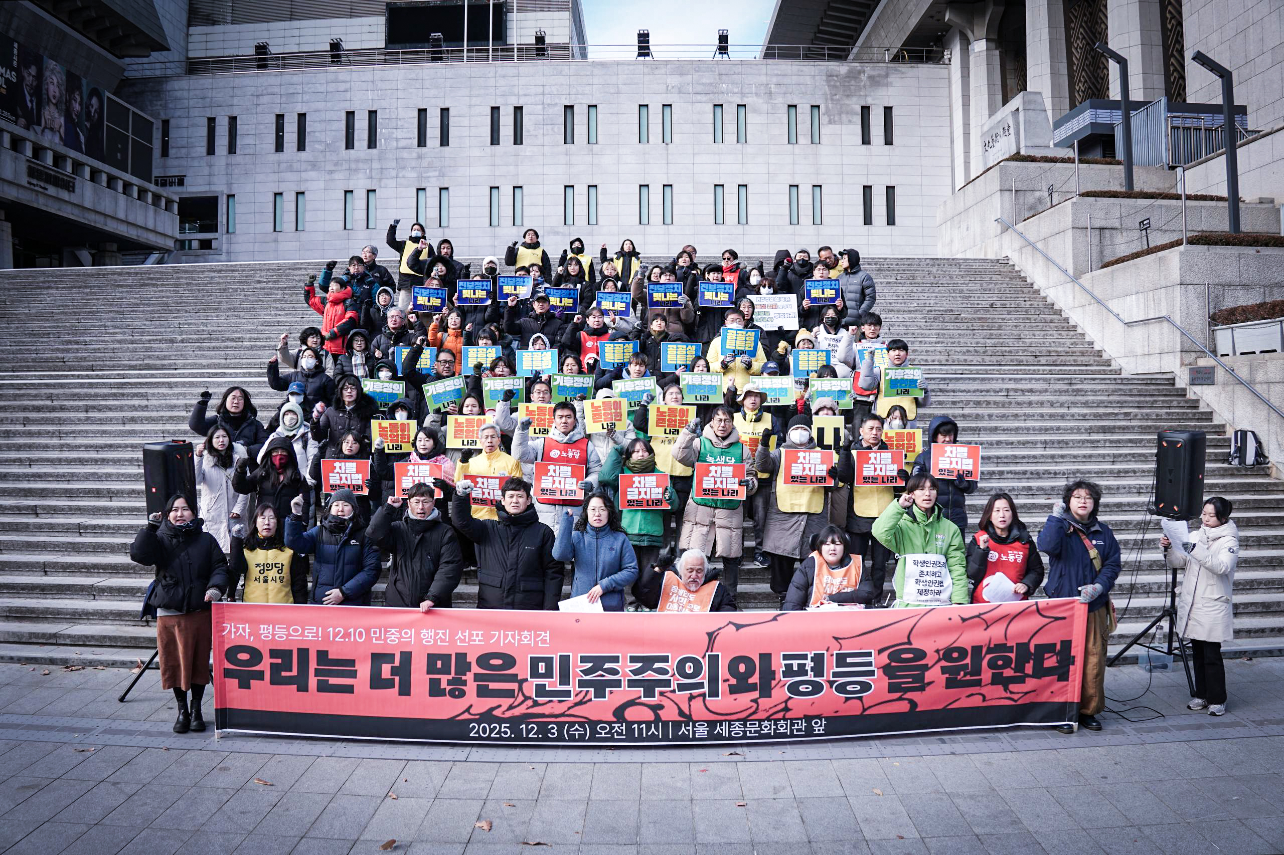 기자회견 참가자들은 “극우가 번성하는 토양을 바꾸기 위한 사회대전환에 나설 때에만 우리 사회는 새로운 민주주의를 향해 한 발 내딛을 수 있다”라고 여전히 남아있는 민주주의의 과제들에 대해 이야기했고, 차별금지법 있는 나라, 노동이 존엄한 나라, 기후정의 당연한 나라, 공공성 든든한 나라, 진보정치 빛나는 나라를 위해 다시 광장에 모이자는 다짐과 함께 12월 10일 민중의 행진을 진행할 것임을 선포했습니다.