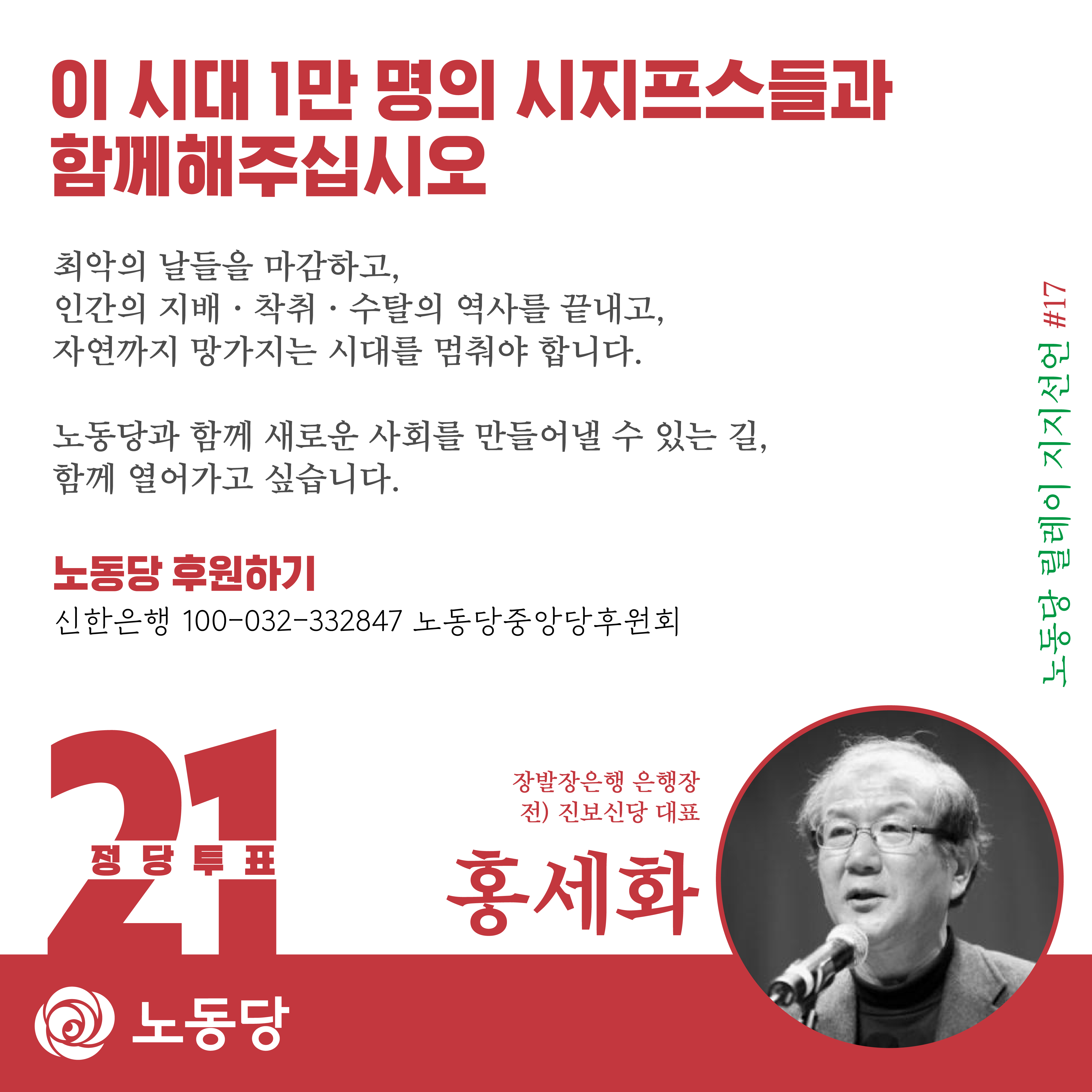 노동당 릴레이 지지선언 #17] 홍세화 장발장은행 은행장, 전 진보신당 대표