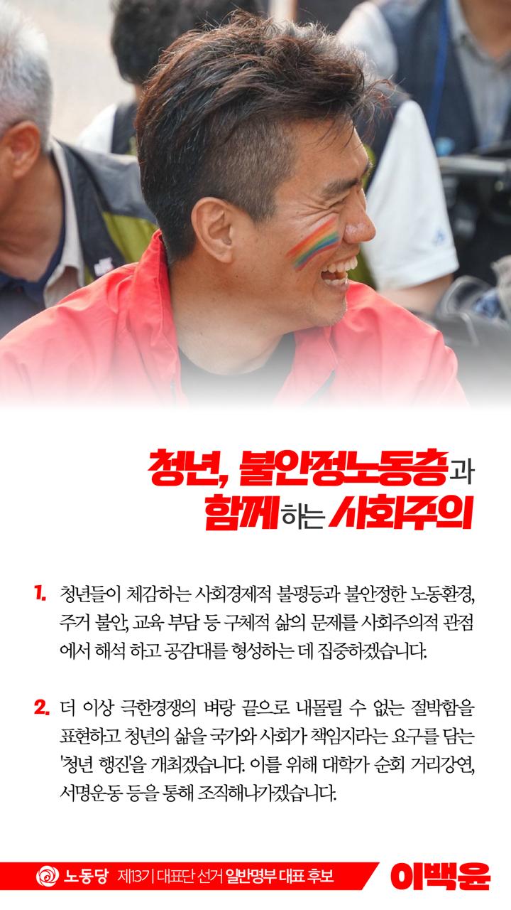 - 청년들이 체감하는 사회경제적 불평등과 불안정한 노동환경, 주거 불안, 교육 부담 등 구체적 삶의 문제를 사회주의적 관점에서 해석하고 공감대를 형성하는 데 집중하겠습니다.