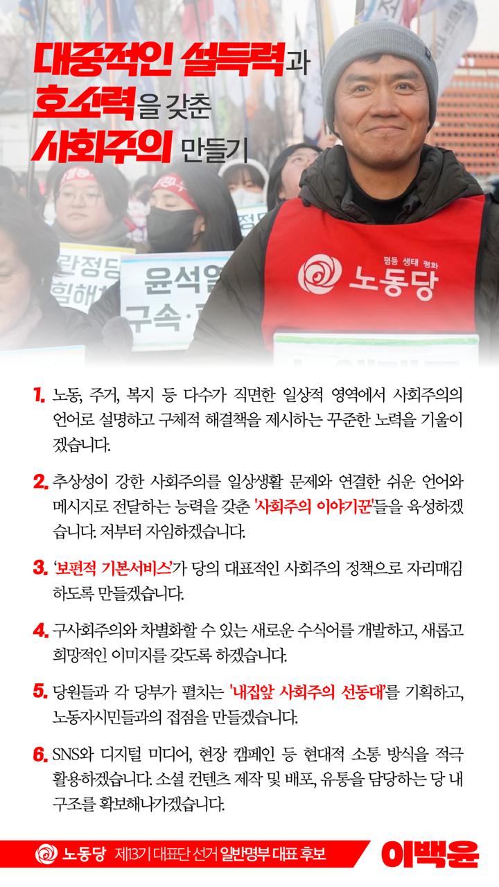 - 노동, 주거, 복지 등 다수가 직면한 일상적 영역에서 사회주의의 언어로 설명하고 구체적 해결책을 제시하는 꾸준한 노력을 기울이겠습니다.