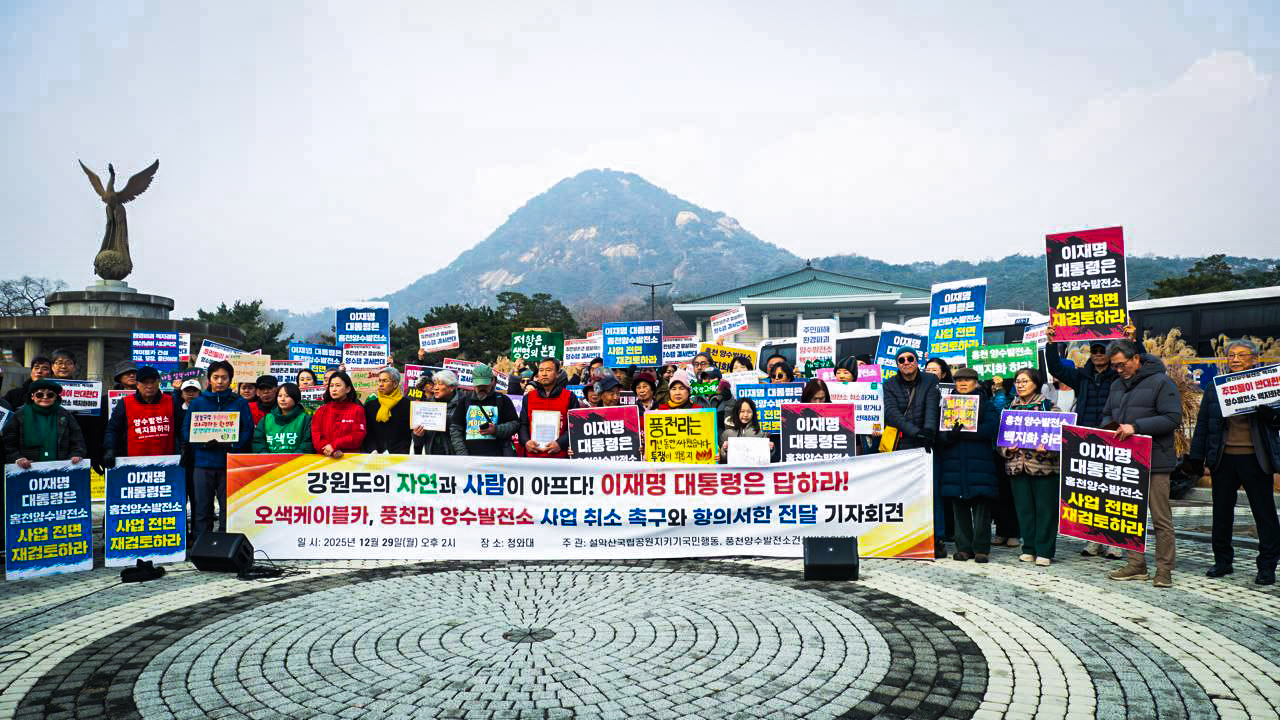 고유미 대표는 기자회견 발언을 통해 풍천리 양수발전소와 설악산 케이블카 사업 추진을 강하게 비판했습니다. 고유미 대표는 양수발전소 사업과 케이블카 사업으로 이익을 보는 것은 소수의 기업과 기관들이고, 피해는 모두 결정에서 배제된 사람들에게 집중된다는 점에서 두 사업은 하나로 연결되어 있음을 지적했습니다. 고유미 대표는 또한 “이 사업들이 과연 공공의 이름으로 추진될 자격이 있는가, 누군가의 삶을 담보로 한 사업을 충분한 동의와 명확한 책임 소재 없이 밀어붙이는 것이 정당한가”라며, “이전 정부의 결정을 그대로 승계할 것인지, 아니면 중단할 것인지 분명히 답해야 한다”라고 이재명 정부의 사업 백지화 결정을 촉구했습니다.