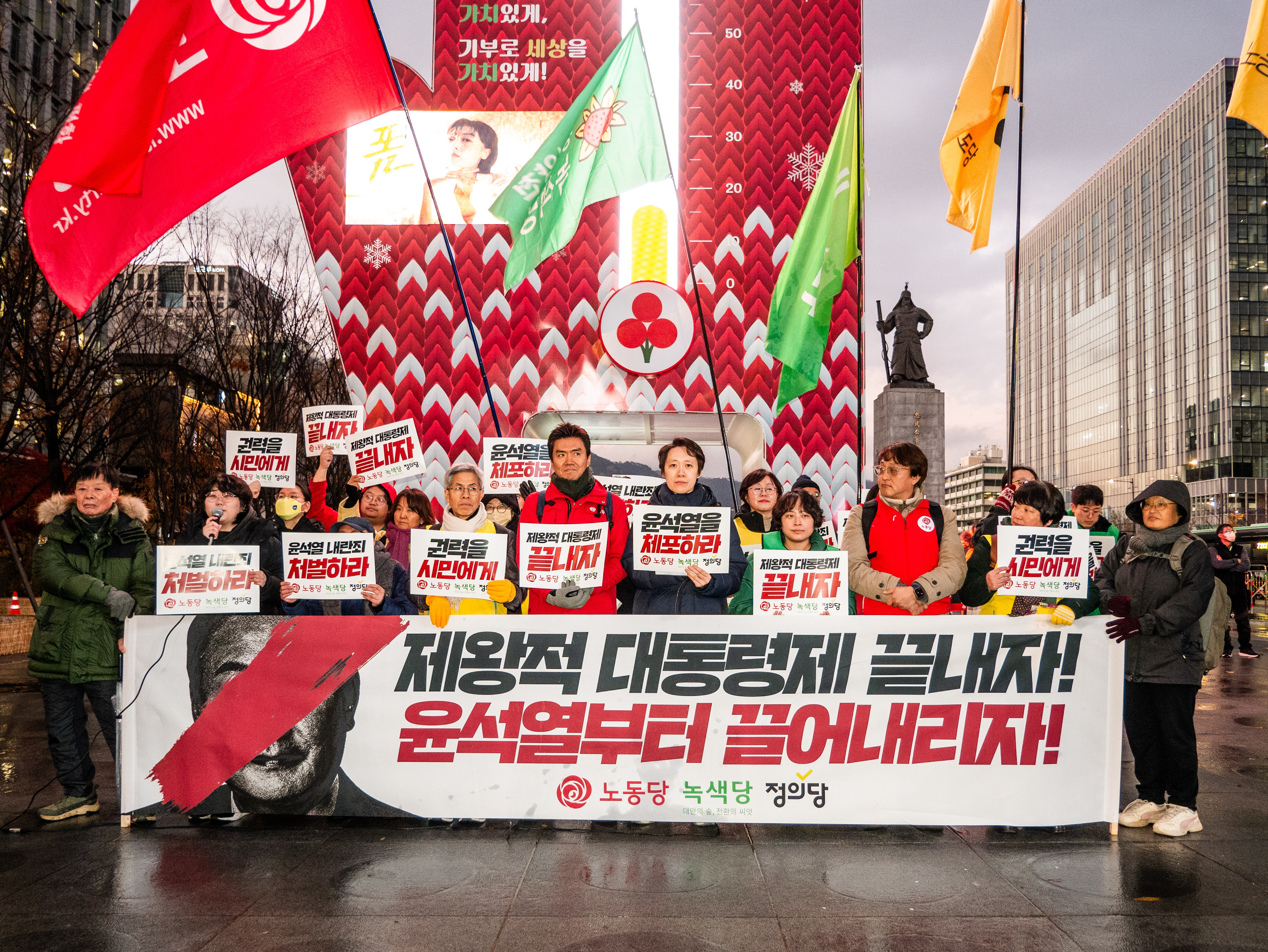 진보3당은 오후 5시 광화문광장으로 자리를 옮겨, 매일 진행 중인 윤석열 퇴진 정당연설회를 진행했습니다. 김성봉 노동당 부대표의 정권 규탄 발언에 더해, 노동당의 청소년 당원인 우서현 당원의 발언이 이어졌습니다.