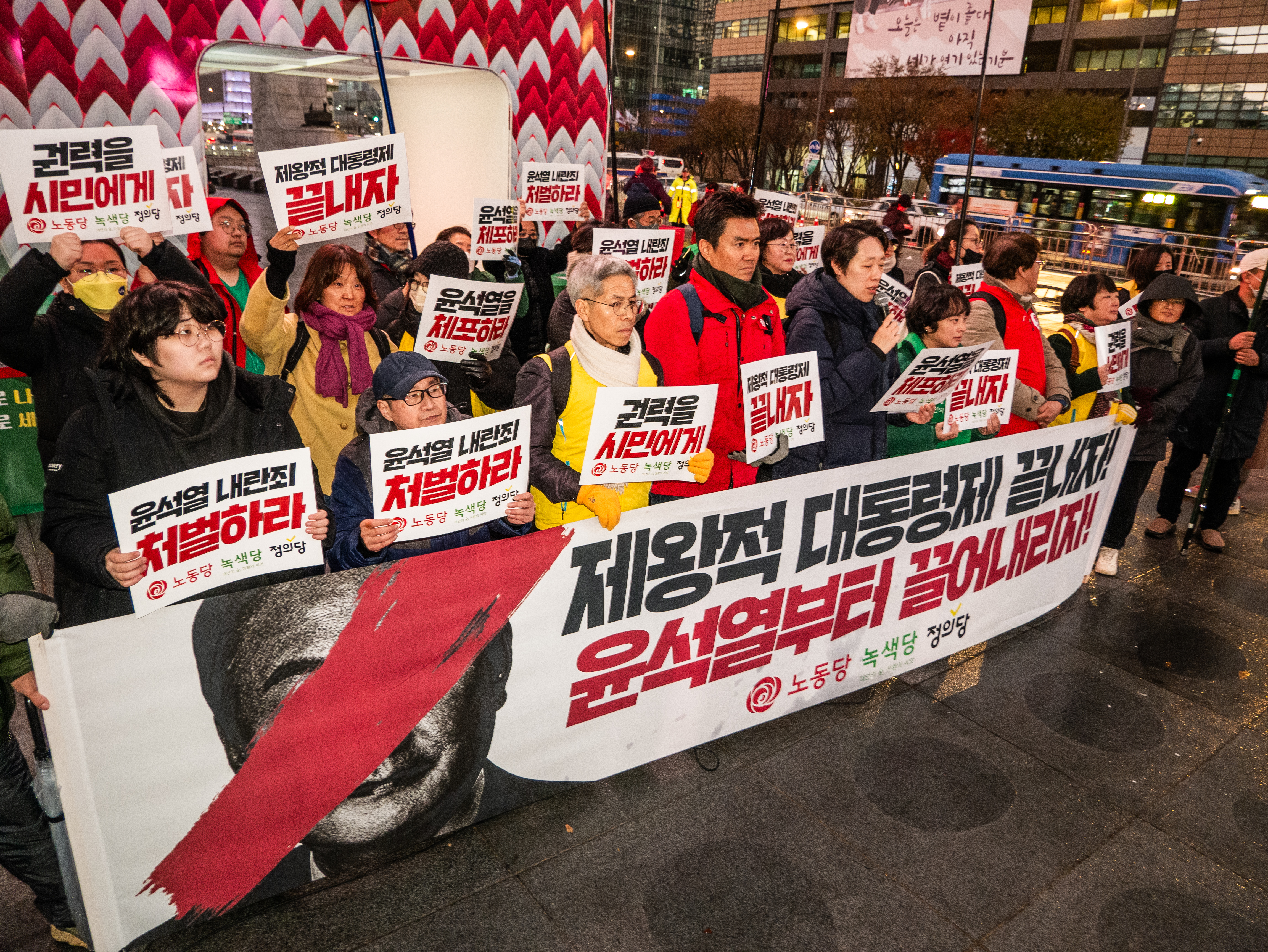 정당연설회 이후, 노동당은 동화면세점 앞 촛불집회에 합류해 윤석열 퇴진을 염원하는 시민들과 함께 행진했습니다.