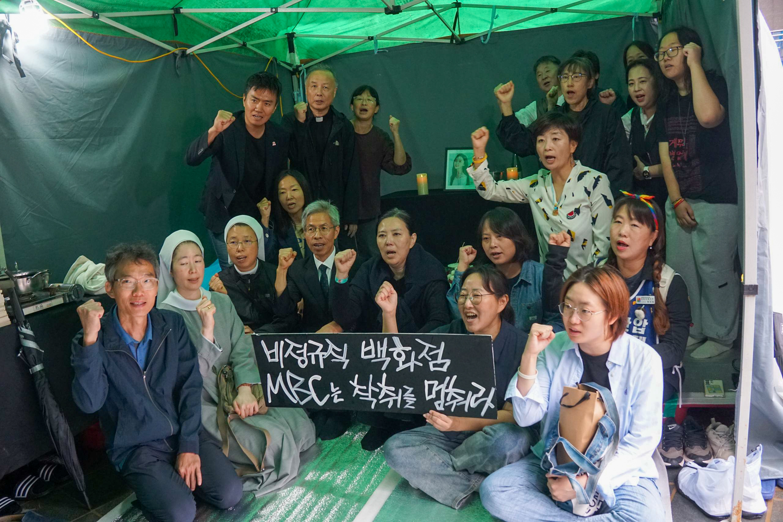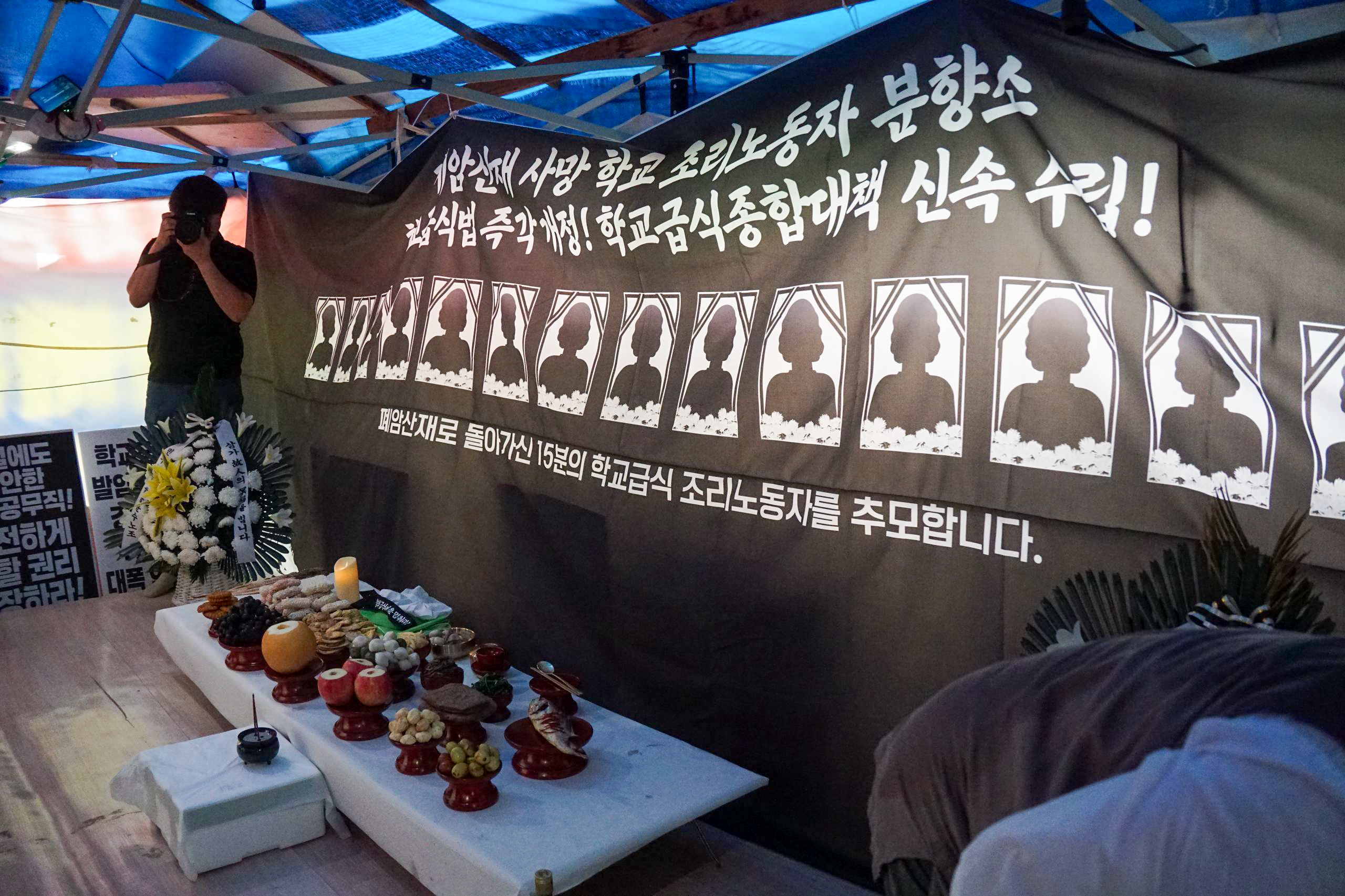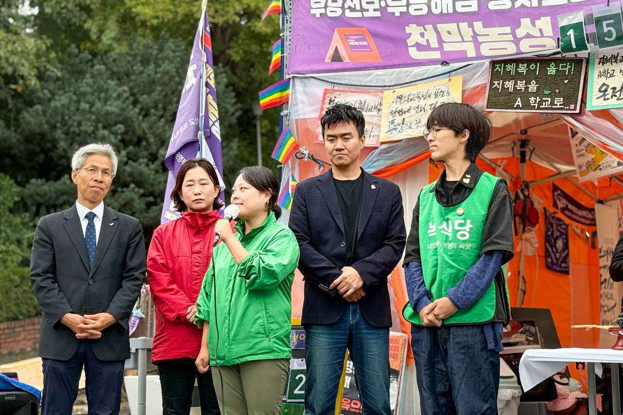 9시 30분 국회 앞 학교급식노동자 폐암 산재사망 추모 분향소를 시작으로, 어제 잠정 합의 전까지 유가족이 단식농성 중이었던 상암 MBC 앞 고 오요안나 비정규직 기상캐스터 분향소와 서울역사의 전국장애인차별철폐연대 농성장을 들렀고, 이어 서울시교육청 앞 A학교 지혜복교사 부당징계 철회 농성장과 세종호텔 앞 고공농성장까지 방문하며 거리 차례를 진행했습니다.