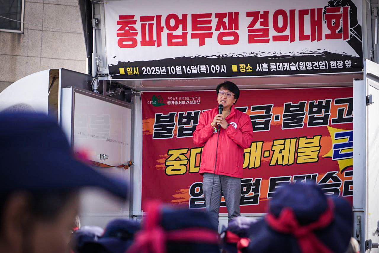 건설노동자들이 총파업투쟁의 결의를 다지며 거리로 나왔습니다. 16일 어제 건설노조 경기중서부건설지부는 <건설현장 4대악 근절! 2025 임단협 승리! 건설노동자 총파업투쟁 결의대회>를 열었습니다. 경기도 시흥 롯데건설 원영건업 올레건설 현장 앞에서 열린 이 날의 결의대회에 노동당 김성봉 부대표가 참석해 건설노동자들의 투쟁에 연대하겠다는 결의를 밝혔습니다.