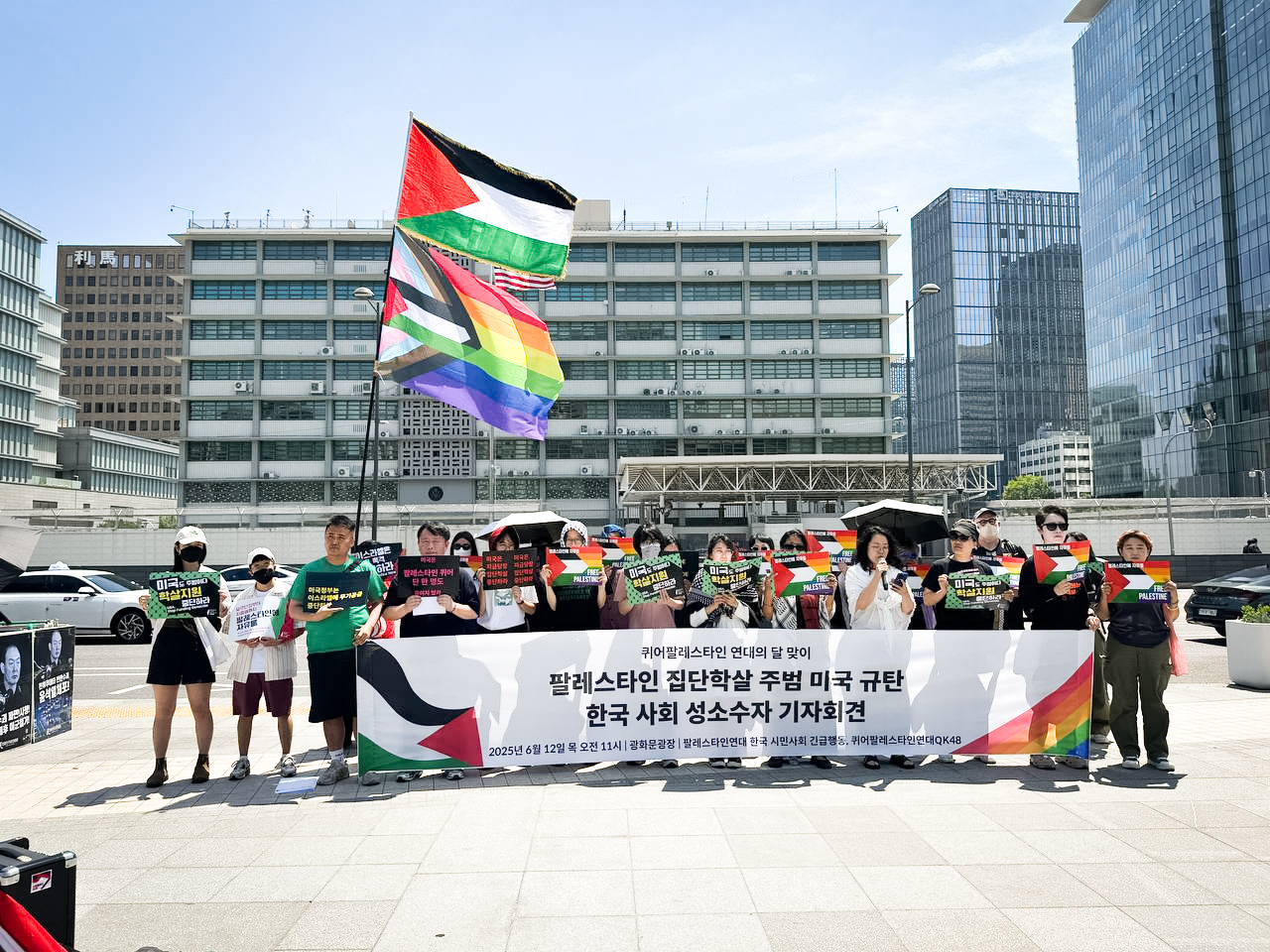 우리 성소수자들은 국제적 팔레스타인 해방 운동의 주요한 주체입니다. 팔레스타인 집단 학살에 동조하고 있는 미국과 서구 국가, 그리고 대한민국에서도 역시 성소수자에 대한 혐오와 차별이 만연하며, 기득권층은 억압과 착취를 정당화하기 위한 맥락에서만 성소수자 인권을 말한다는 것을 삶의 경험을 통해 잘 알고 있기 때문입니다. 팔레스타인의 성소수자 활동가들 역시 거짓 성소수자 자긍심을 앞세워 팔레스타인을 식민지배하는 이스라엘이 자신들의 삶을 가장 크게 위협한다고 이야기하며, 전 세계의 성소수자 공동체에 이스라엘 보이콧과 팔레스타인 연대를 호소하고 있습니다.