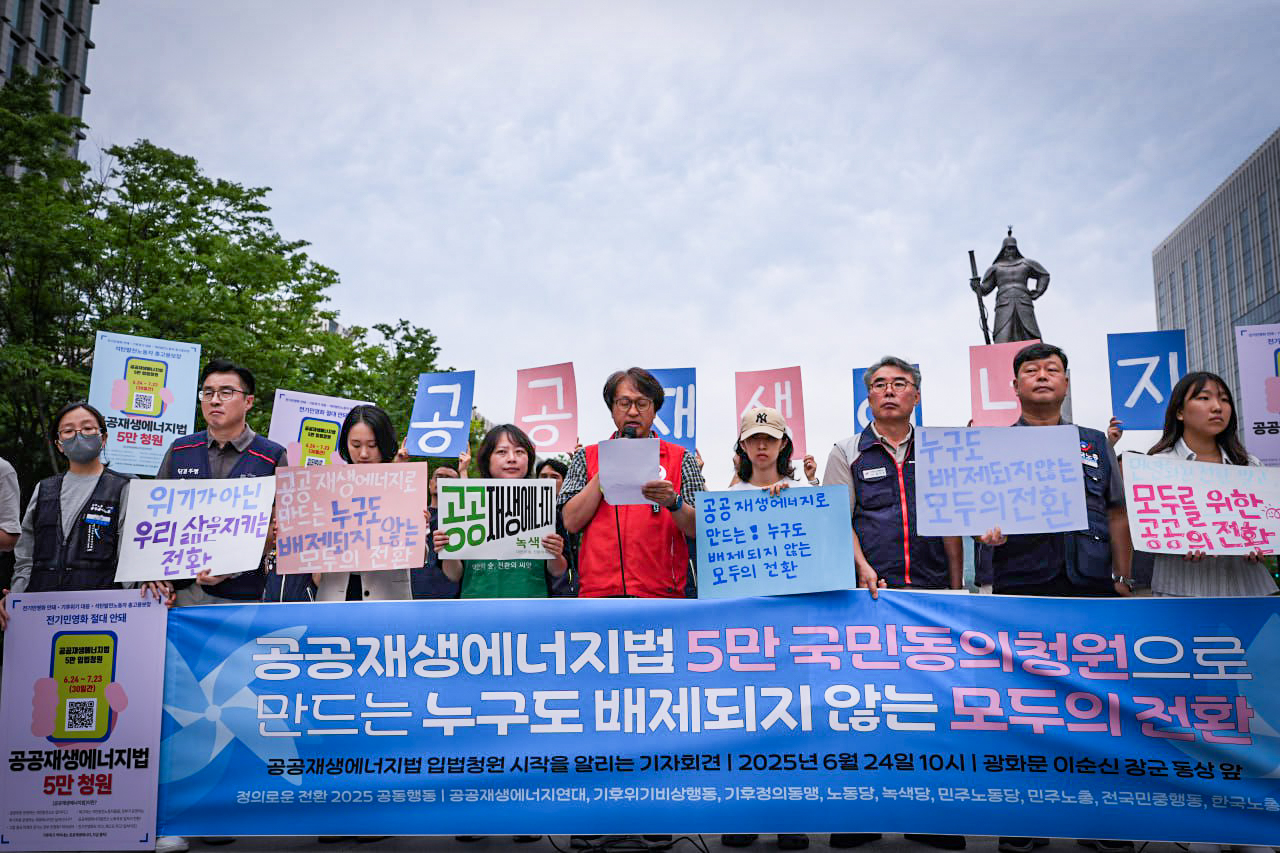 오늘 11시 광화문광장에서 공공재생에너지법 5만 입법청원의 시작을 알리는 기자회견이 열렸습니다. 노동당 김성봉 부대표가 함께해 공공재생에너지법 제정을 촉구했습니다.