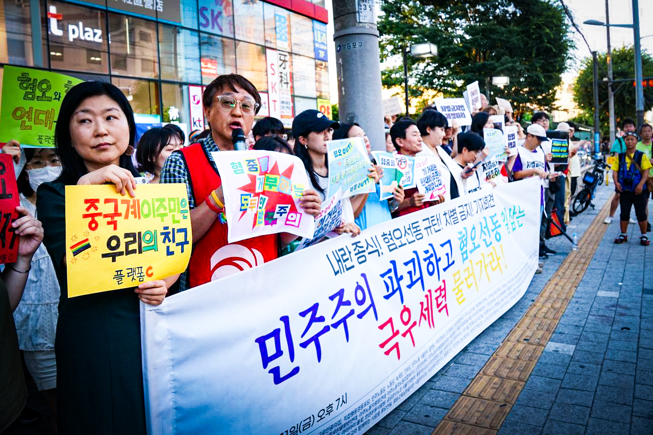 어제 오후 7시, 대림역 10번 출구 앞에서 <민주주의 파괴하고 혐오선동 일삼는 극우세력 물러가라> 기자회견이 열렸습니다. 극우세력의 중국계 이주민 혐오 집회에 대항하여 열린 기자회견에 노동당 김성봉 부대표와 노동당 당원들이 함께했습니다.
