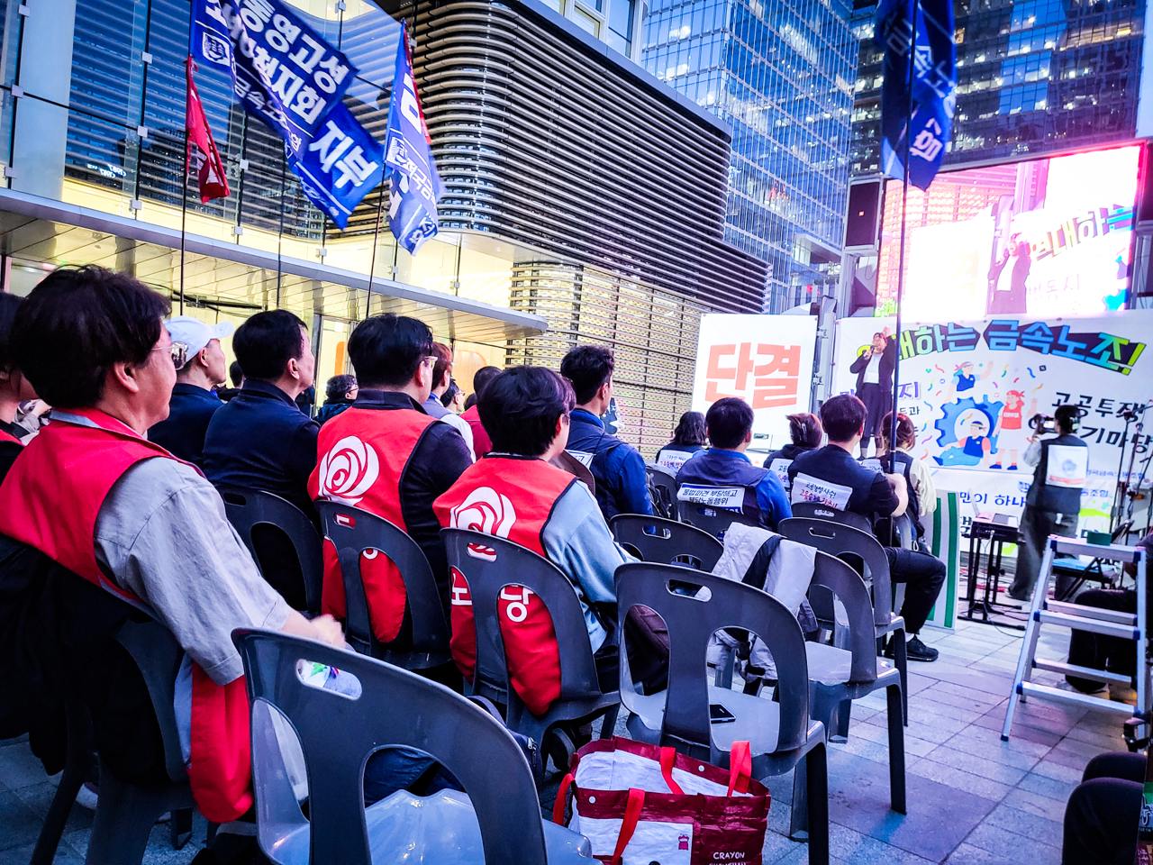 한화 본사 앞 거통고 고공농성장에서 열린 문화제 참가자들은 애플 영업점 앞을 행진하며 ‘먹튀자본’ 닛토덴코와의 거래 중단을 요구했고, 세종호텔 앞까지 행진을 이어가며 고공농성 중인 노동자들의 투쟁에 함께하겠다는 결의를 다졌습니다.