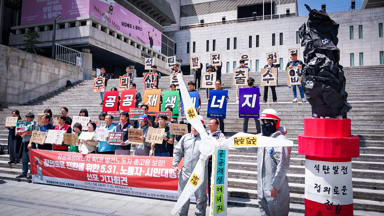 5월 31일, 정의로운 전환을 요구하는 노동자-시민들의 집회가 충남 태안과 경남 창원에서 동시에 열립니다. 5월 8일 어제 11시 30분, 5.31 노동자 시민 대행진을 선포하는 기자회견이 서울 세종문화회관 앞에서 열렸습니다. 김성봉 부대표 등 노동당 당원들이 기자회견에 함께하여 정의로운 전환을 촉구하는 석탄화력발전소 노동자들의 투쟁에 힘을 보탰습니다.