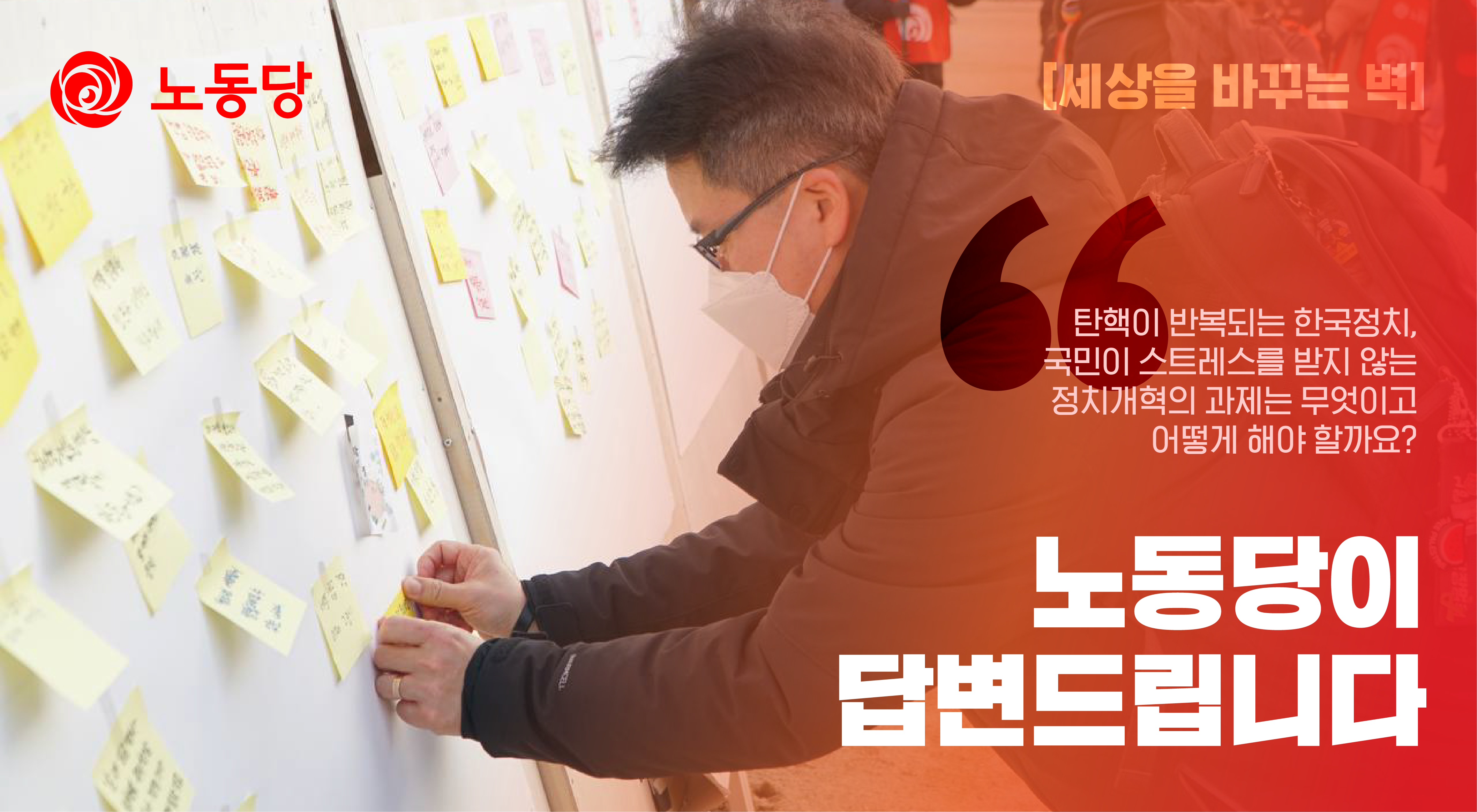 노동당이 함께하고 있는 “윤석열 퇴진! 세상을 바꾸는 네트워크”에서는 매주 토요일 열리고 있는 범시민대회 현장에서 “세상을 바꾸는 벽”을 운영하고 있습니다. 윤석열 없는 새로운 세상이 어때야 하는지, 광장의 시민분들께 의견과 질문을 받고 있는데요, 많은 시민분들께서 정치개혁의 과제에 대한 질문을 남겨 주셨습니다.