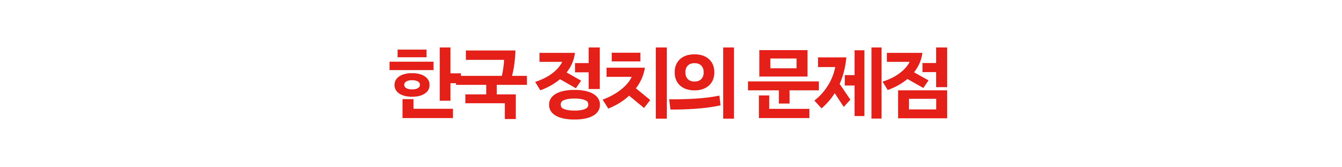 한국 정치는 소선거구제 단순다수대표제 중심의 보수양당체제와 실제로는 큰 의미가 없는 비례대표제, 보수양당과 기득권에게 일방적으로 유리한 각종 특권으로 특징지어집니다. 또한 직접민주주의적 제도의 미흡함, 정치적 의사 형성을 방해하는 각종 제약, 지방자치제도의 취약함 등 많은 문제를 지니고 있습니다.