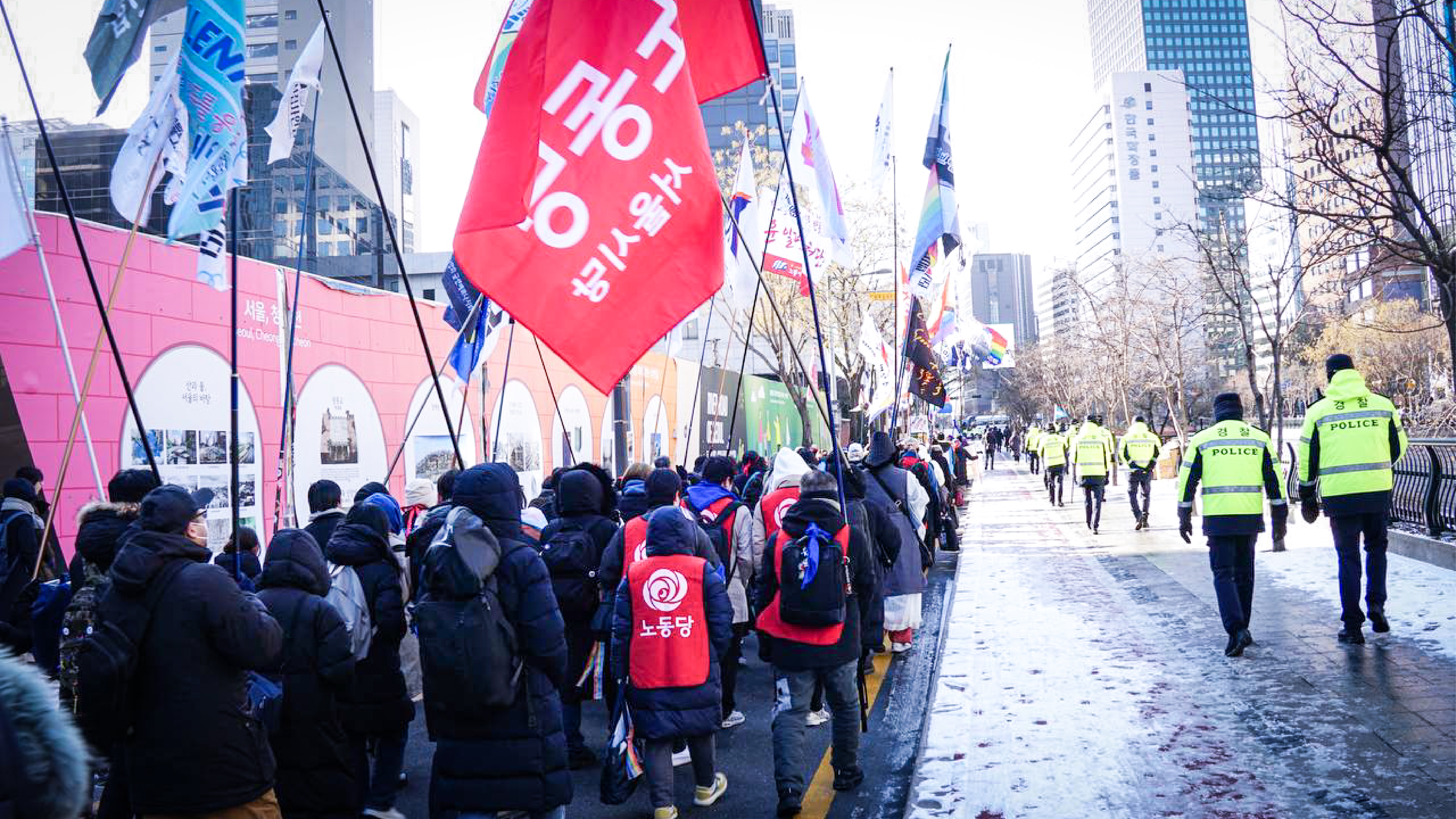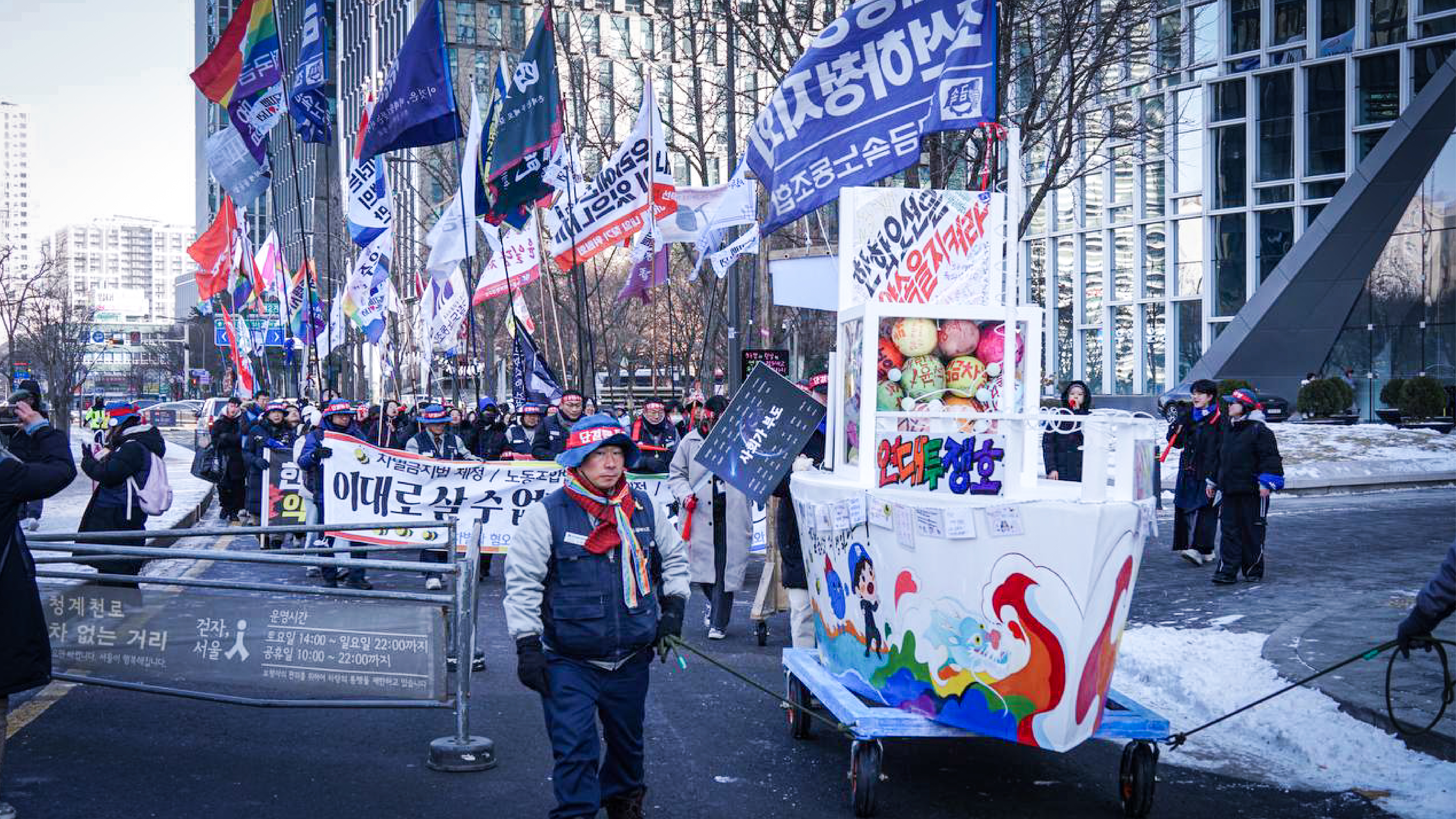 한화오션 사내하청노동자들이 농성을 진행 중인 한화 본사 앞 무지개조선소에서 노동자와 시민이 함께 만들고 이름지은 연대투쟁호의 진수식이 열렸습니다. 노동자와 시민이 서로 동지로 만나, 새로운 세상을 열어가는 연대의 따뜻함을 드러내는 무지갯빛 연대투쟁호는 진수식 이후 윤석열 퇴진 범시민행진이 진행되는 광화문까지 항해했습니다. 인간다운 삶을 위한 투쟁이 죄가 되지 않는, 연대와 해방의 세상으로 노동당이 함께 연대투쟁호 타고 갑니다!