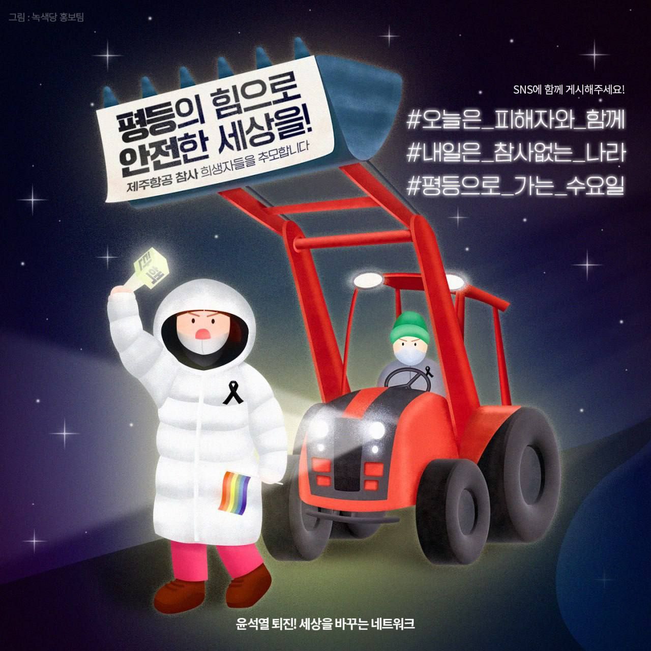 안전한 세상을, 모두의 존엄한 삶의 권리가 지켜지는 세상을 거리에서 함께 만들어 나갑시다. 우리의 애도는 광장을 향합니다. 제주항공 여객기 참사 희생자들의 명복을 빕니다.