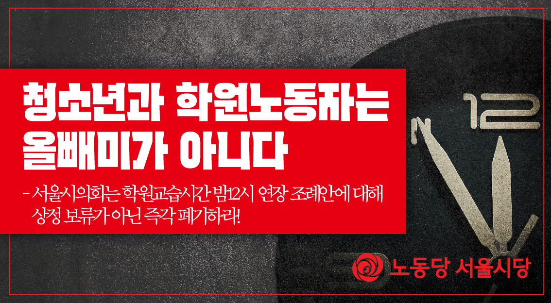 ‘학원이 잠시만 멈추면 학생들의 숨통이 트입니다’라고 말하는 청소년의 한숨에 담긴 의미를 우리 사회가 귀 기울여야 할 때다. 노동당 서울시당은 서울시민의 일부로서 조례안을 규탄하며, 끝까지 투쟁할 것이다.