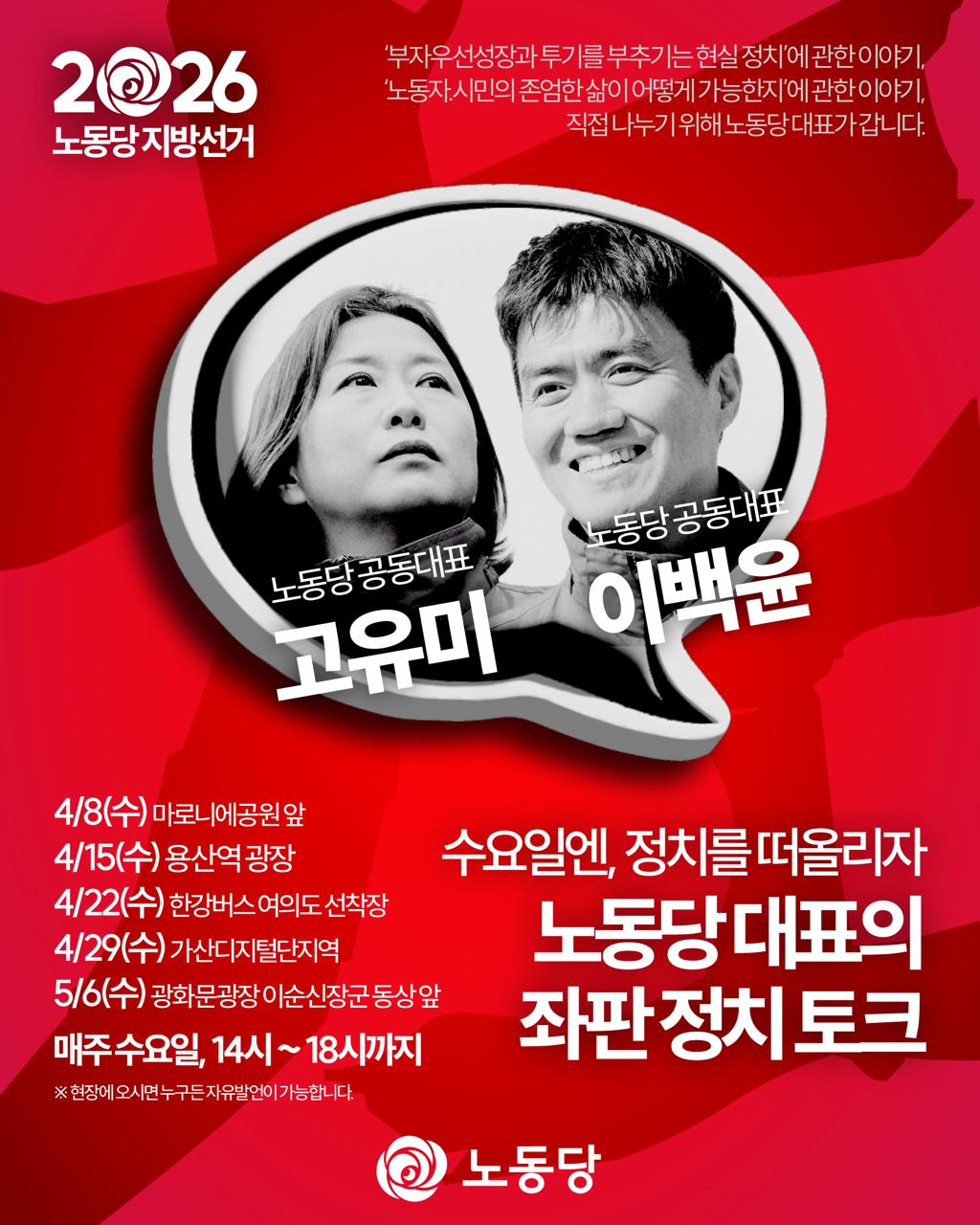 거리 토크쇼를 주최한 노동당 대표들의 발언도 이어졌다. 이백윤 공동대표는 “내란 청산을 앞세우면서도 불평등 해소에는 제자리걸음인 불평등정치를 넘자”라며, 이번 지방선거의 의미가 “내란 청산뿐 아니라 불평등 청산”이 되어야 한다고 밝혔다.