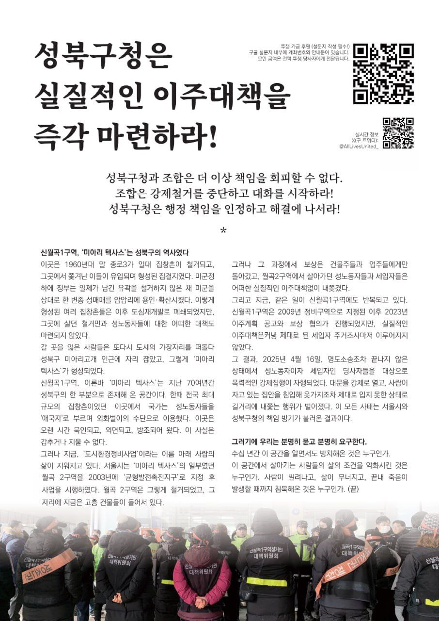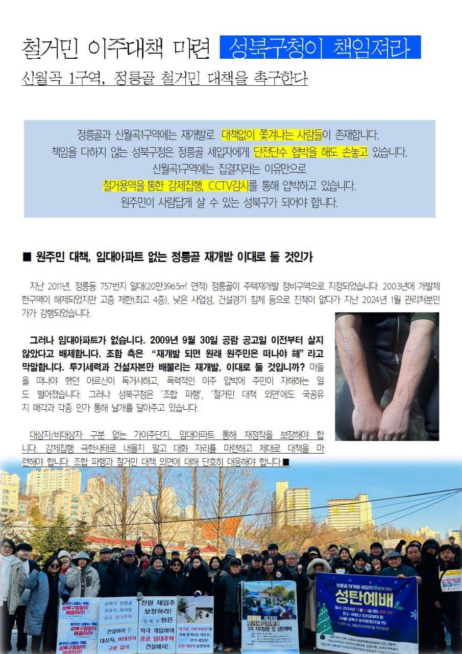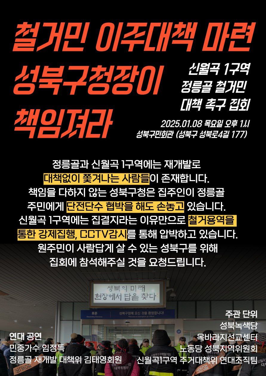 서울에서도 특히 개발지역이 많은 성북구임에도 개발로 밀려나는 철거민들에 대한 대책이 제대로 보장되지 못하고 소위 미해당자라고 배제하고, 터무니 없이 낮은 수준의 대책만, 그것도 재개발조합과 건설자본들에 의해 좌지우지 되는데도 성북구청은 이를 방관하고, 심지어 국공유지 매각, 각종 인허가 통해 방조하고 있습니다.