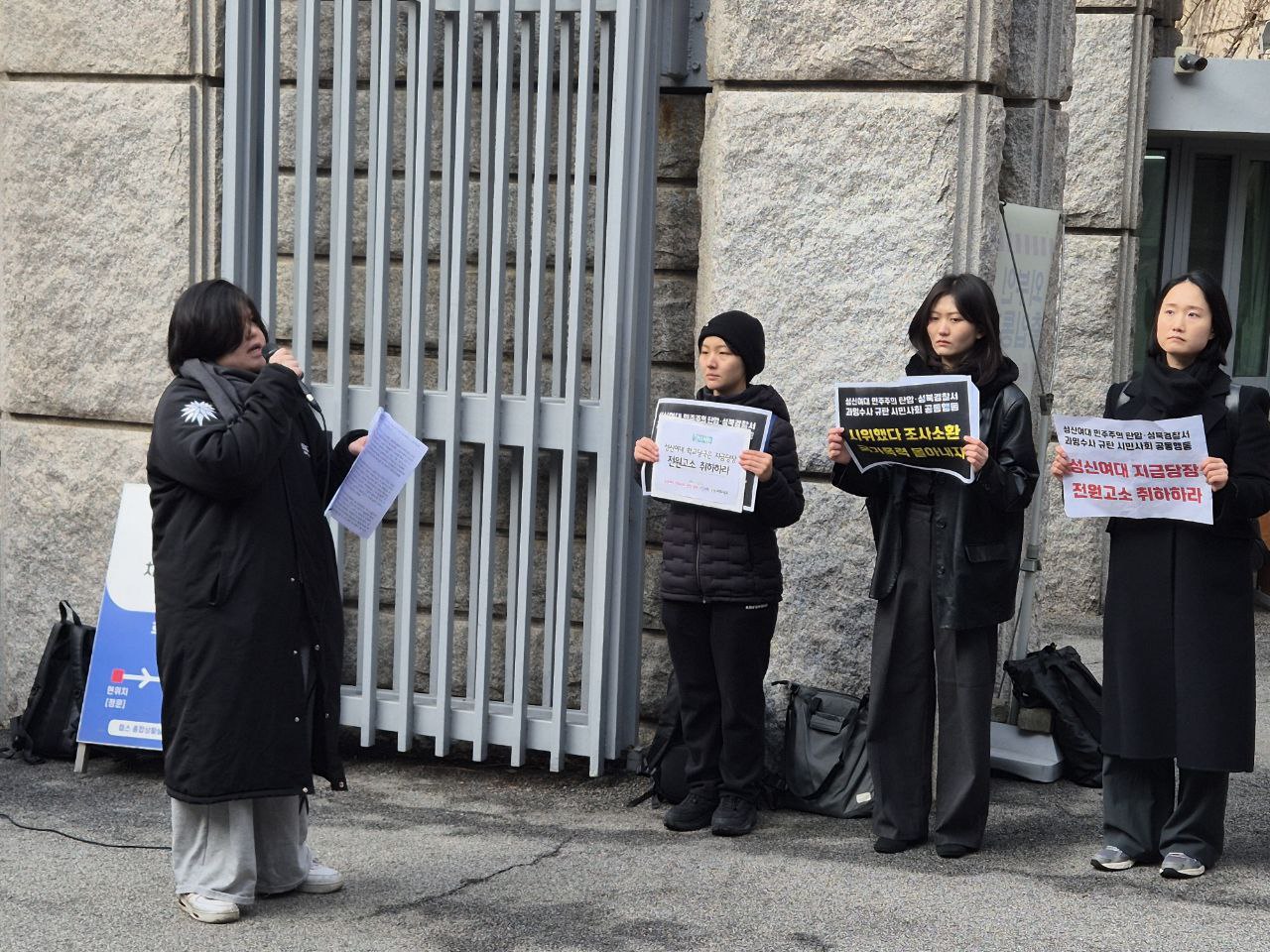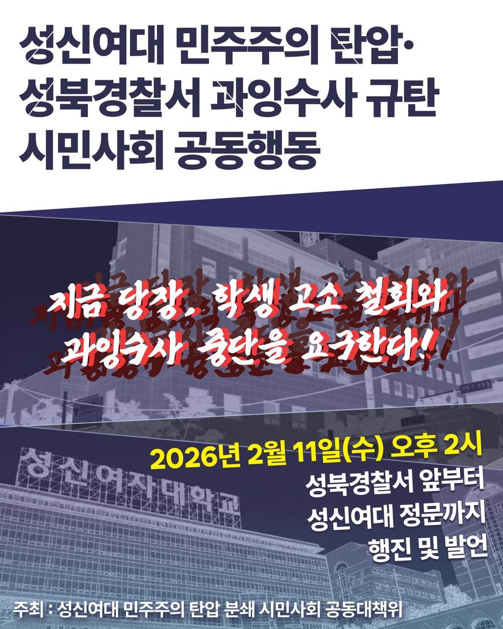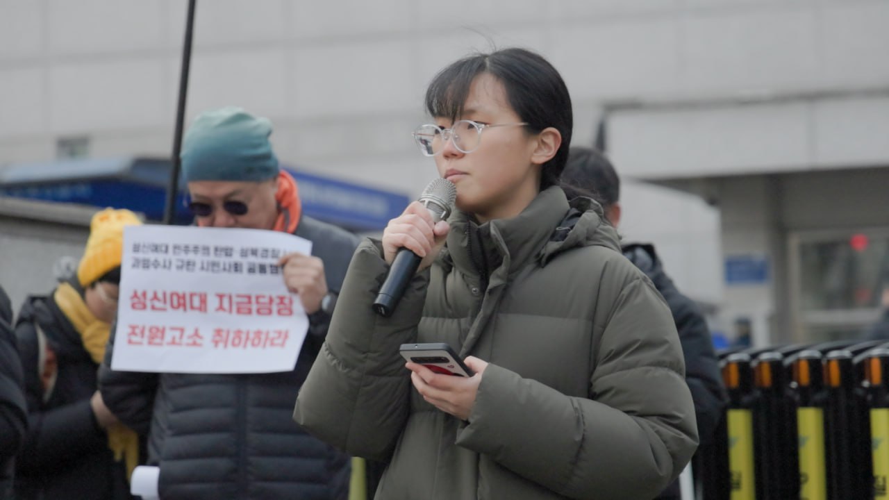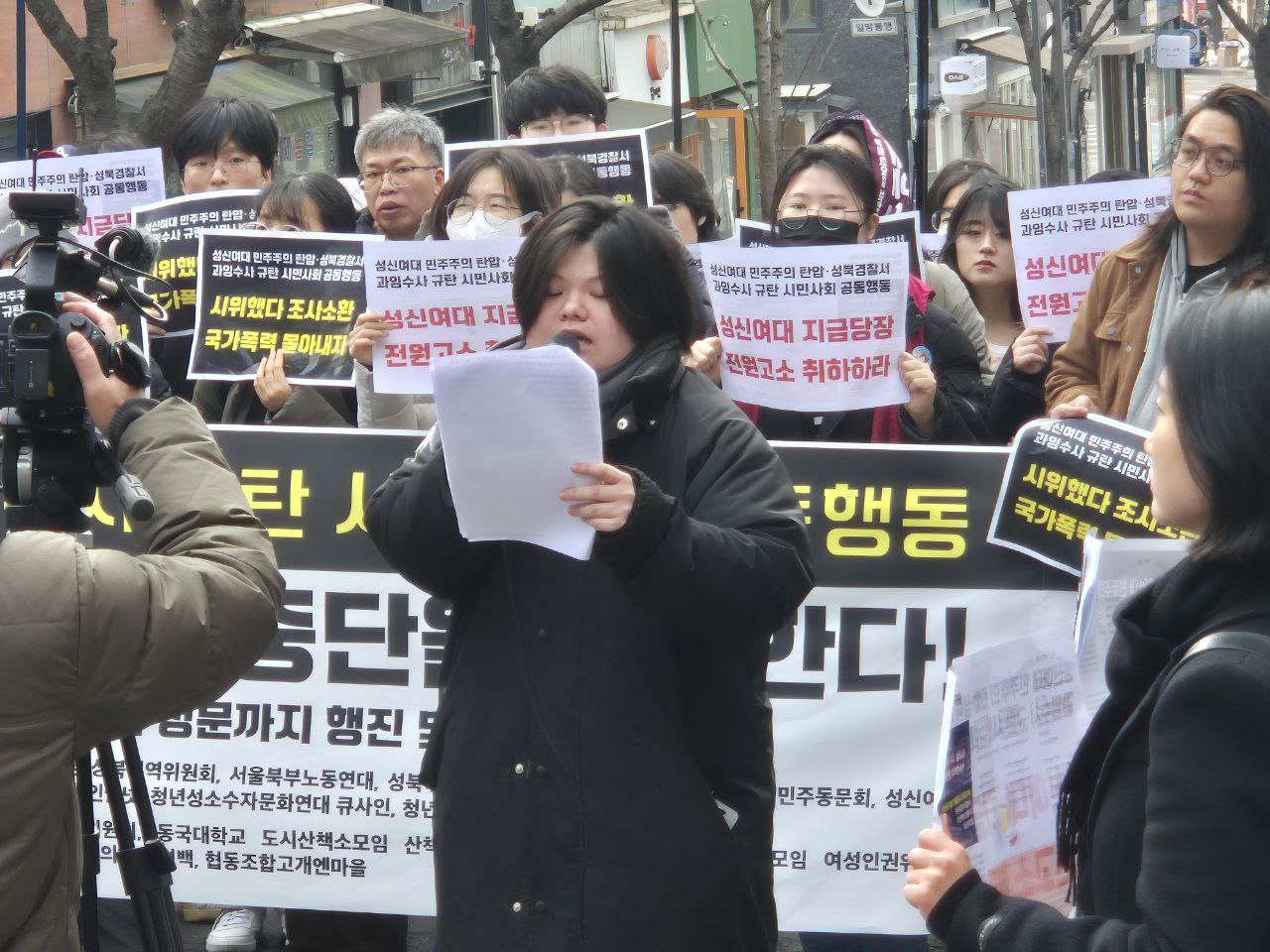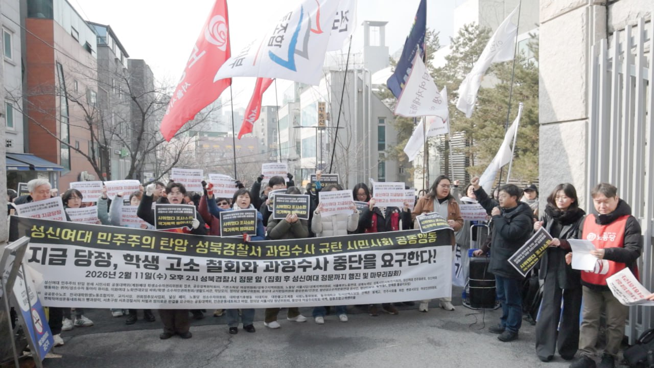 오늘 우리는 성신여자대학교에서 벌어지고 있는 학내 민주주의 탄압과 이를 확대시키고 있는 성북경찰서의 과잉수사를 규탄하기 위해 이 자리에 섰다. 지금 이 사안은 일부 학생의 문제가 아니라 대학 사회 전반의 민주주의가 심각하게 훼손되고 있음을 보여주는 사례다.