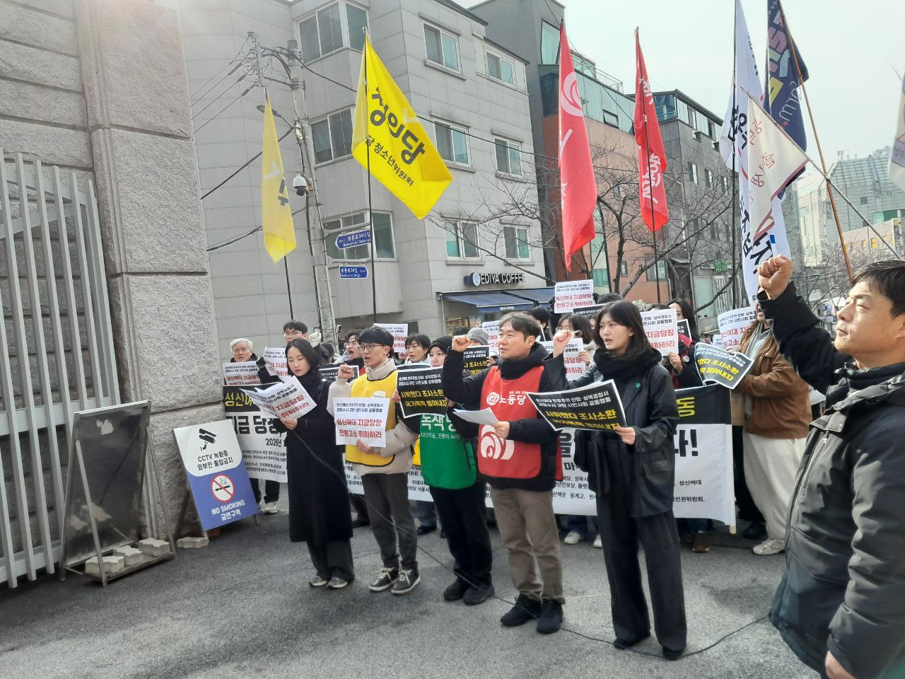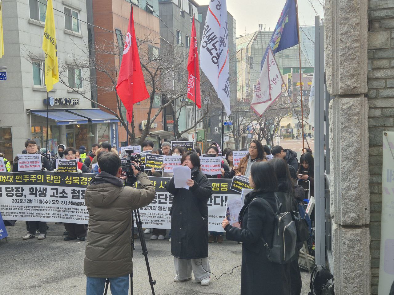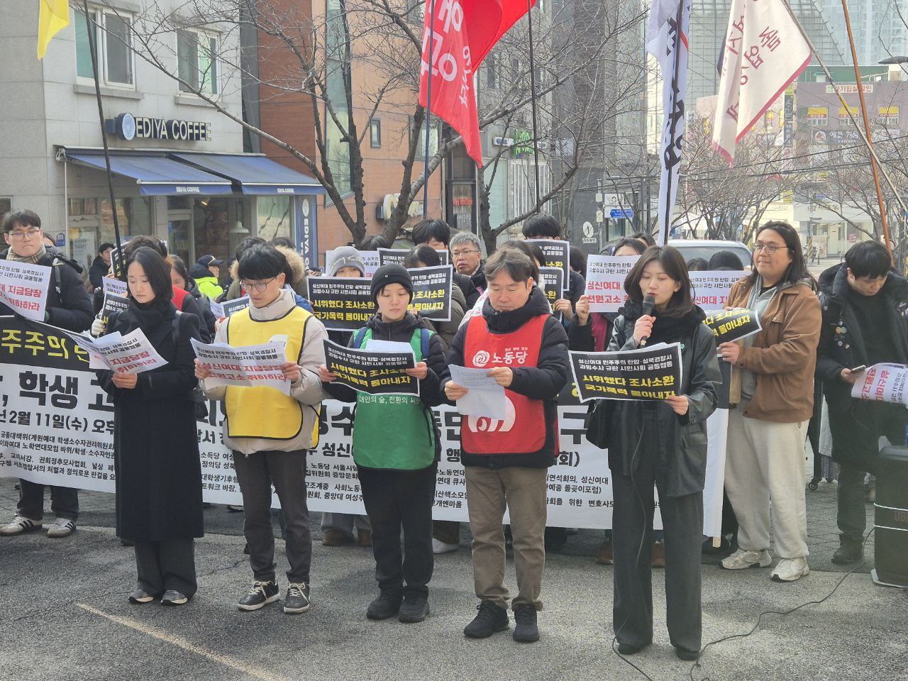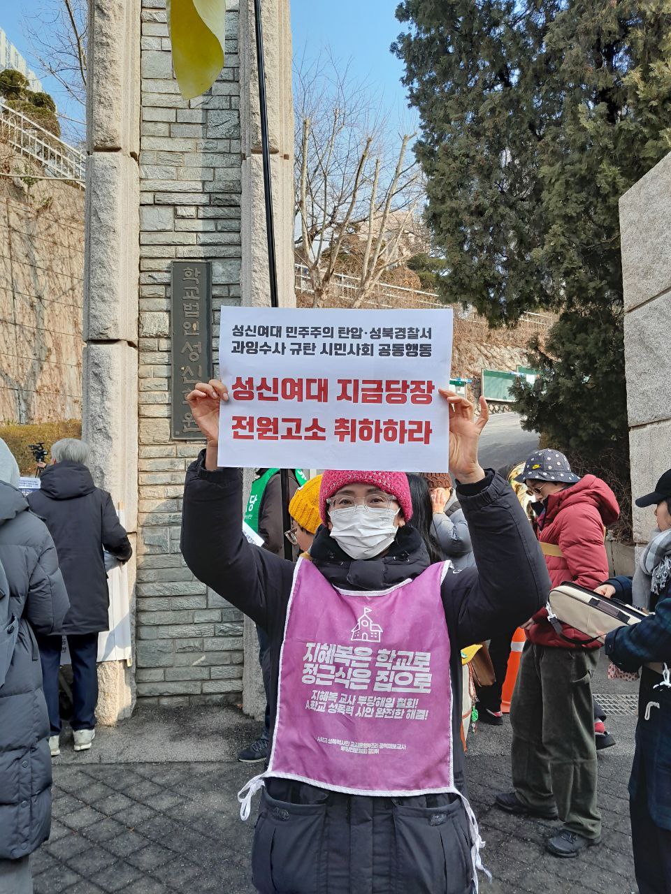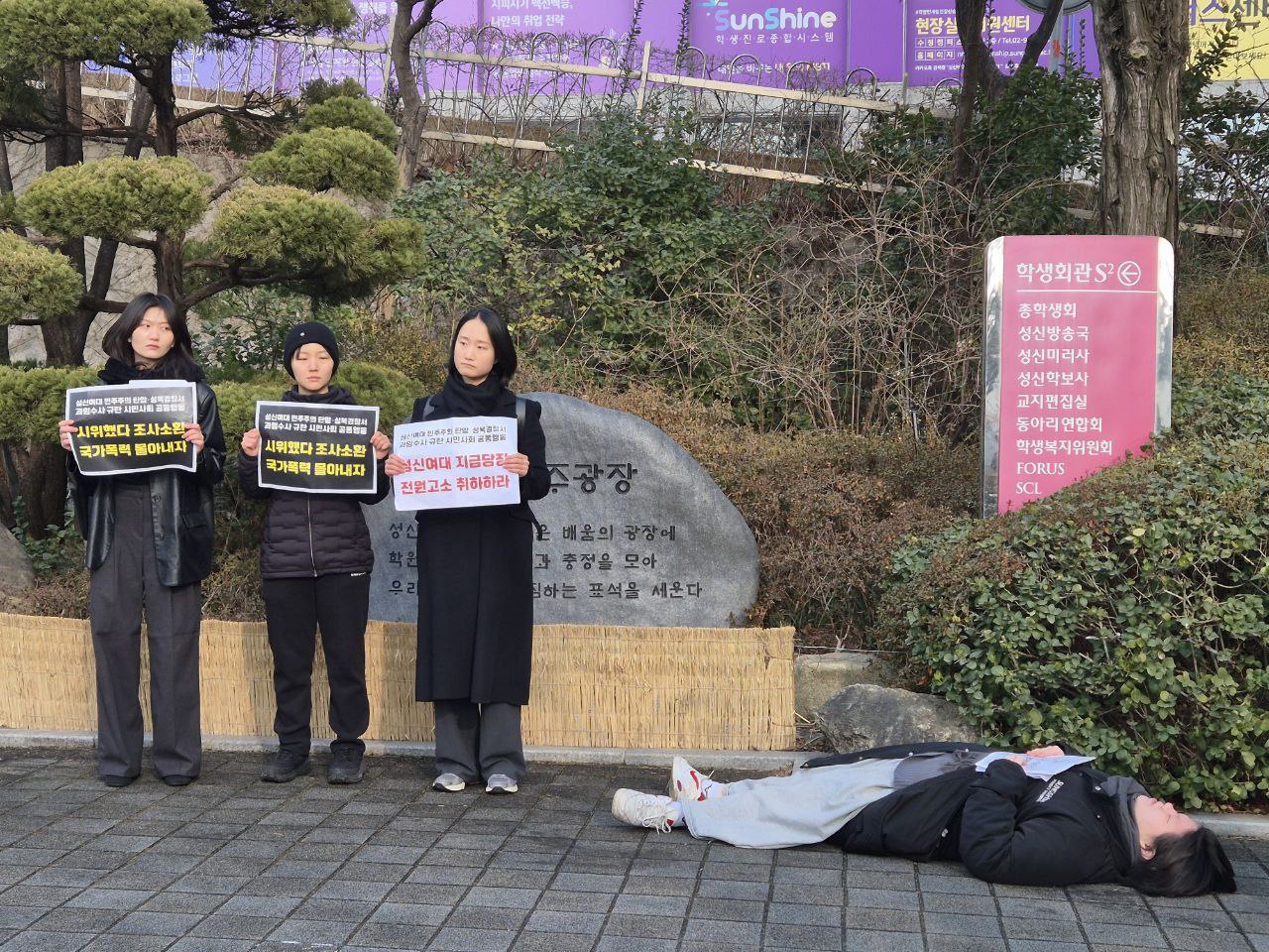 오늘 우리는 성신여자대학교에서 벌어지고 있는 학내 민주주의 탄압과 이를 확대시키고 있는 성북경찰서의 과잉수사를 규탄하기 위해 이 자리에 섰다. 지금 이 사안은 일부 학생의 문제가 아니라 대학 사회 전반의 민주주의가 심각하게 훼손되고 있음을 보여주는 사례다.