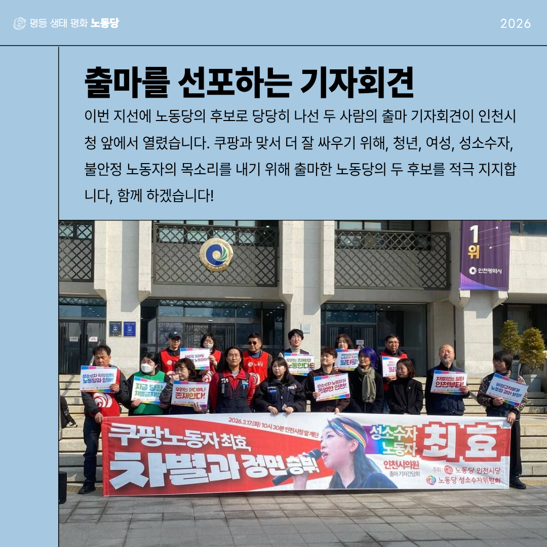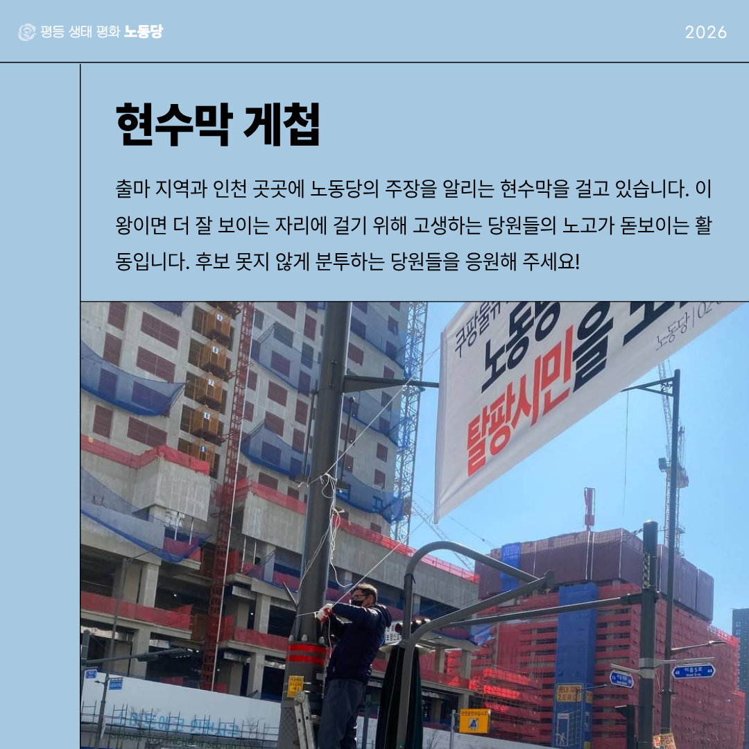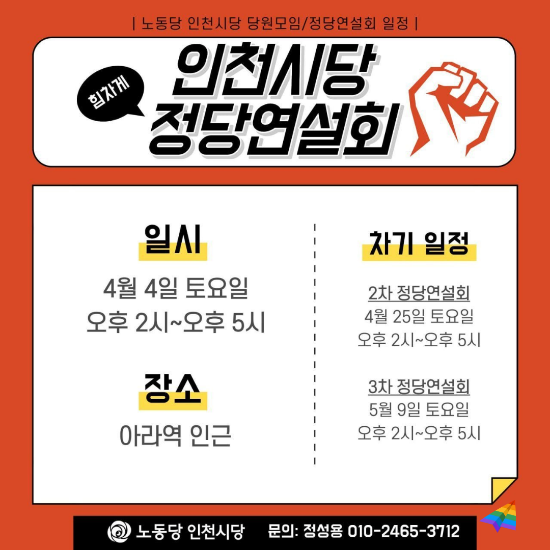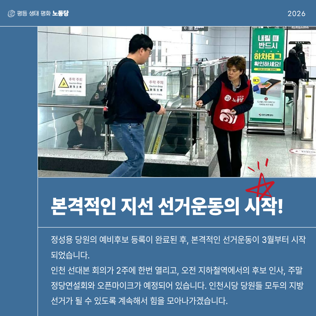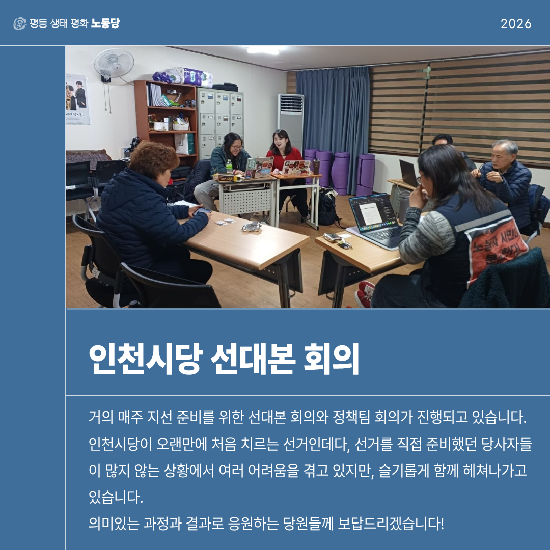 모든 인천시당 당원이 후보나 선본을 책임지고 있는 당원들처럼 선두에서 활동할 수는 없겠지만, 각자의 자리에서 기꺼이 가능한 방식으로 모두가 함께하는 지방선거 투쟁으로 만들어 갔으면 좋겠습니다!