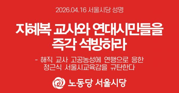 홈페이지브리핑&일정 +더보기 썸네일 제목 작성일 “내란 청산뿐 아니라 불평등 청산으로” 노동당, 성소수자·장애인 지방선거 출마자들과 함께 거리 토크쇼 진행 2026.04.09 성명&논평 +더보기 썸네일 제목 작성일 N 서울시당 성명] 지혜복 교사와 연대시민들을 즉각 석방하라 00:44 노동당 Youtube이슈 페이퍼 +더보기 썸네일 제목 작성일 REd View: 노동 (노동운동동향보고) 11호 2026.03.24 공지 +더보기 제목 작성일 [경기도당] 노동당 경기도당 통합2기19차 운영위원회 결과보고 [보고] 노동당 경기도당 통합2기19차 운영위원회 회의결과 [회의개요] □ 일시 : 2026년 04월 14일(화) 19:00 □ 장소 : 온라인 □ 참석 : 나도원(위원장, 구리남양주), 정동헌(부위원장, 수원오산화성), 김동성(고양파주), 김호중(안산), 홍성우(경기중부) 이상 5인 □ 사고 : 0 □ 불참 : 엄정흠(평택안성) 이상 1인 □ 배석 : 김성수(집행위원) 이상 1인 [보고] 보고1. 중앙보고 보고1-1. 2026년 3차 전국위원회 회의결과 - 문서와 구두로 보고함. 보고1-2. 2026년 지방선거 중앙선거대책본부 회의결과 - 문서와 구두로 보고함. 보고2. 지역보고 보고2-1. 노동당 경기도당 통합2기18차 운영위원회 회의결과 - 문서로 보고함. 보고2-2. 노동당 경기도당 예결산위원회 회의결과 - 문서로 보고함. 보고2-3. 노동당 경기도당2026년 정기대의원대회 결과 - 문서로 보고함. 보고2-4. 지역위원회 보고 - 문서로 구두로 보고함. - 고양파주지역위원회 소경준 후보 선거 진행 상황을 공유함(추후 문서로 제출). 보고3. 사업/연대 보고 보고3-1. 경기사회대전환연대회의 대표자회의 결과 - 문서와 구두로 보고함. 보고3-2. 가자! 평등으로 경기평등조례제정네트워크 집행위원회 - 문서로 보고함. 보고3-3. (가칭) 삼성반도체 김치엽노동자 자살 진상규명 대책위 3차 회의 - 자료로 보고함. 보고4. 조직/재정 보고 - 문서와 구두로 보고함. [논의결과] 안건1. 경기도당 지방선거 대응계획의 건 - <노동당 경기도당 제9회 전국동시지방선거 대응계획> 원안을 확정함. - <대응계획>에 따라 후속 조치를 진행하기로 함. 안건2. 경기도당 정기대의원대회 후속 조치의 건 - 경기도당 당기위원회 위원 추천과 선출 일정을 원안대로 진행하기로 함. 기타. 기타. 향후 주요일정 - 향후 주요일정을 확인함. - 쿠팡 산재피해 유가족 순회일정을 공유하고 지역별 참가를 요청함. ○ 차기회의(가) : 2026년 05월 13일(화) 19시 ※ 회의자료 : [경기도당] 통합2기19차 운영위원회 회의자료 – 노동당 2026.04.15 2026년 지방선거 중앙선거대책본부 회의결과 2026년 지방선거 중앙선거대책본부 회의결과 일시 : 2026.04.13.(월) 14:00 장소 : 중앙당사 참석 : 고유미, 이백윤, 김성봉, 정상천, 유용현, 이종희, 안창준 보고1] 상집 주간업무 및 주요 일정 보고 - 보고를 접수함 - 노동당 대표 좌판정치토크에 대하여 : 장소가 해당 사업에 영향을 크게 미친다는 점에서 1회차 장소는 적절했음 : 초대 손님에 대한 정보를 사전에 확보하여 사전 취재요청서에 실릴 수 있도록 조치하기로 함 - 차별금지법제정연대 대표자 회의에 대하여 : 지난 회의에 제출했던 OSF기금을 전제한 사업계획과 예산안을 집행위가 철회함 : 수정된 사업계획과 예산안은 추후 집행위에서 논의하여 제출하기로 함 - 4/14(화)부터 지방의회 5% 봉쇄조항 신속 결정 촉구 1인 시위를 시작하기로 함 보고2] 사무총국 주간업무 보고 - 보고를 접수함 - 신입당원 가입시, 당부 차원에서 안내와 소통방 초대 등이 진행될 수 있도록 주기적으로 환기하기로 함 - 4/17(금)까지 5/1 메이데이 현수막 디자인 작업을 완료하여 각 당부에서 게첨할 수 있도록 준비하기로 함 보고3] 전차 회의결과 보고 - 문서로 대체함 보고4] 위원회 및 사업단 활동 보고 - 문서를 토대로 보고를 진행함 - 5월 중 추가 간담회 진행과 5/23(토) 서사원 폐지 2년을 맞이하여 집회가 예정되어 있음을 공유함. 보고7] 기타 활동 보고 - 문서를 토대로 보고를 진행함 안건1] 2026년 지방선거 공직후보자 선출의 건 - 문서를 토대로 논의를 진행함 - 원안대로 전주시 비례후보로 임소희 당원을 선출하기로 함 안건2] 성소수자특별본부 설치 논의의 건 - 문서를 토대로 논의를 진행함 - 원안대로 성소수자특별본부를 설치하기로 함 안건3] 2026년 지방선거 선전사업 기획 수정의 건 - 문서를 토대로 논의를 진행함 - 원안대로 진행하기로 함 안건4] 기타 안건 논의 - 문서를 토대로 논의를 진행함 - 2026 <5.17 성소수자 평등의 날> 공동행동에 참여하기로 함 차기 회의는 4/20(월), 14시에 중앙당사에서 진행하기로 함 회의자료 https://www.laborparty.kr/?page_id=13932&mod=document&pageid=1&uid=3837&execute_uid=3837 2026.04.14 [공고] 노동당 충남도당 2026년 당직선거 후보자 등록 공고 노동당 충남도당 2026년 당직선거 후보자 등록 결과를 공고합니다. ① 노동당 충남도당 위원장 1인 : 이정호(현 노동당 충남도당 천안아산지역위원장) 2026년 04월 11일 노동당 중앙선거관리위원회 위원장 최경순 (직인생략) 2026.04.11 2026년 13차 상집 및 7차 확집 회의결과 2026년 13차 상집 및 7차 확집 회의결과 일시 : 2026.04.06.(월) 14:00 장소 : 중앙당사 참석 : 고유미, 이백윤, 김성봉, 정상천, 유용현, 이